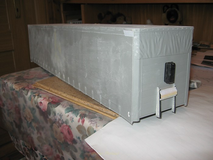 Und für die es interessiert hier mal der Aufbau nach dem Schleifen des Spachtels vor dem grundieren. Die Stirnwand hat noch den Feuerlöscher erhalten. Und die Seitenteile die Griffe für die Plane.