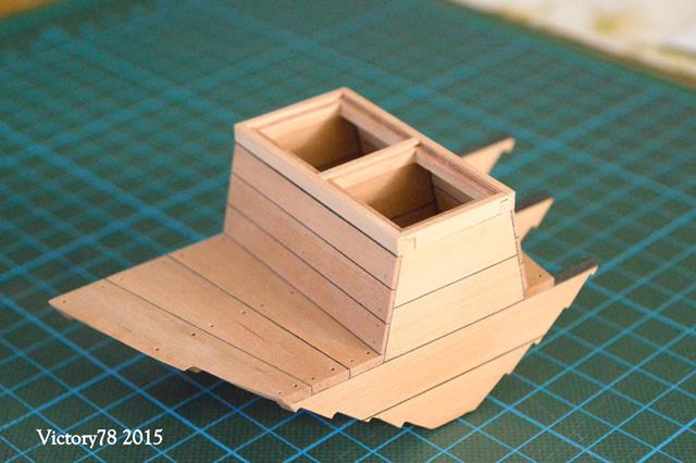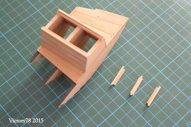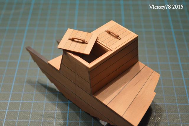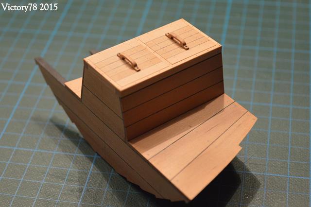 Man wird dort später auch gut den aufgebohrten Rumpf sehen, wodurch der Wasseraustausch zur Frischhaltung der Fischlein erfolgte. Der Eingabeschacht wird oben durch einen Rahmen umschlossen in dem zwei Deckel liegen. Die Rahmenprofile habe ich mit der Fräse hergestellt. Die Hölzer sind in den Ecken verschränkt und eine kleine Nut bildet die Auflage für die Bünndeckel.