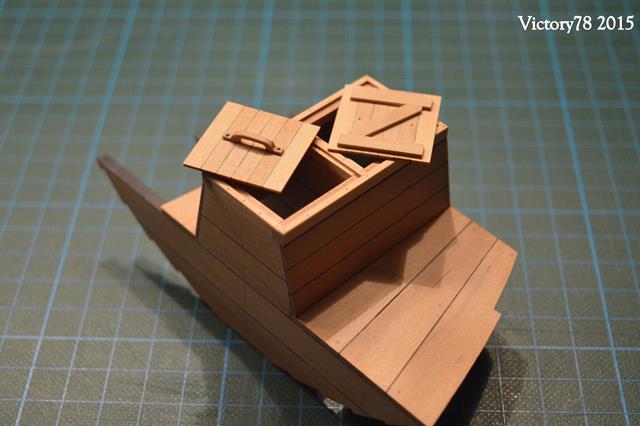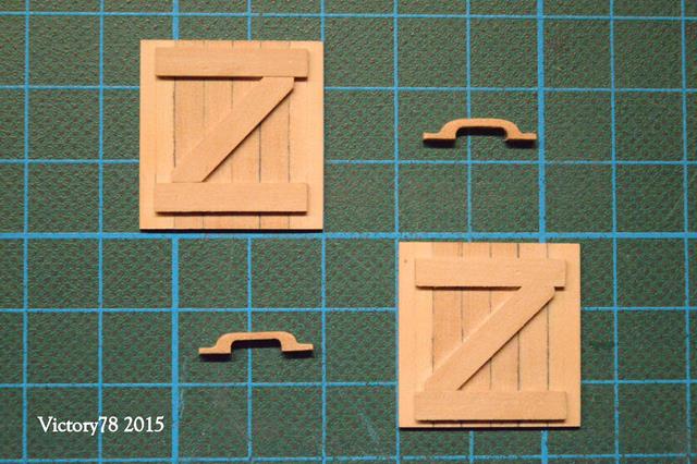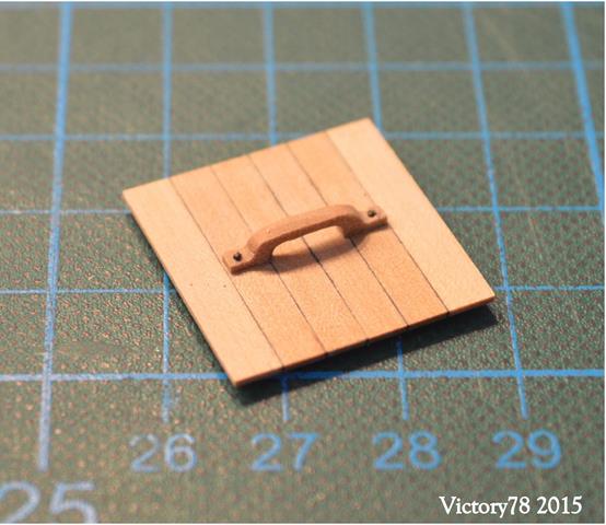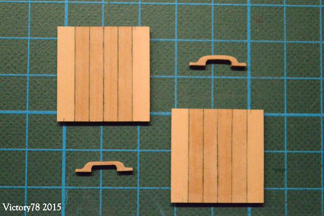 Diese Deckel bestehen aus 6 Hölzern und einer Konterlattung unten. Sie sind im Prinzip wie Fassdeckel hergestellt. Die Fugen habe ich hier versuchsweise mit einem Edding angedeutet und das genügt an dieser Stelle vollkommen. Die Griffe wollte ich anfangs wie im Plan vorgeschlagenen mit Ringbolzen darstellen, aber dann gefielen mir die kleinen Holzgriffe doch besser.