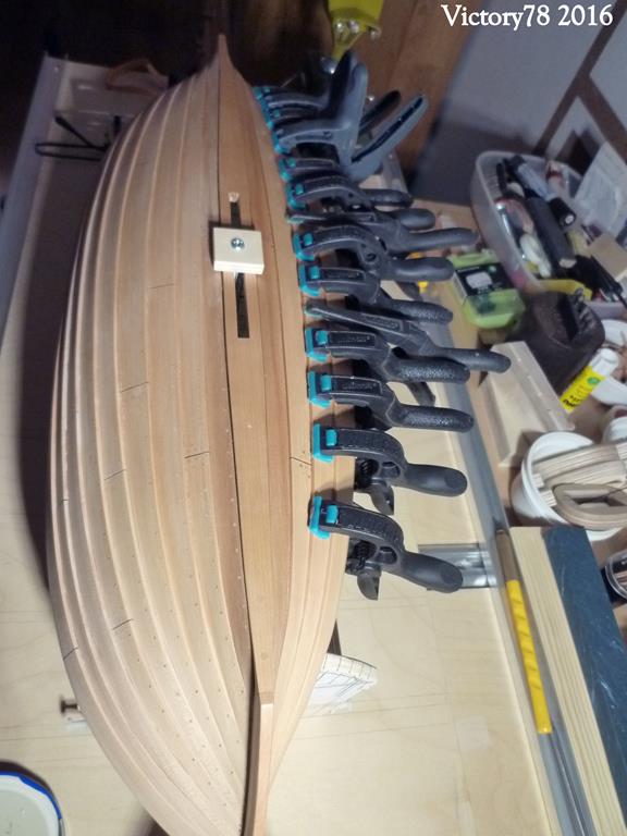 Nachdem ich nun mit dem Rumpfausbau begonnen hatte, stellte sich immer wieder das Problem der fehlenden Steuerbordseite dar. Insbesondere um die Spanten, welche ja der Klinkerung anzupassen sind, herzustellen, war mir das alles zu gewagt. Somit wurden dann halt die fehlenden 5 Plankengänge gezimmert.