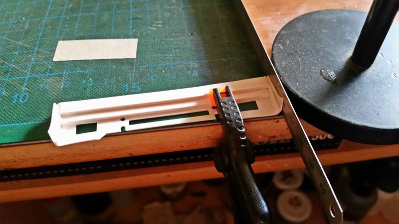 Damit ich nun oben an der Stoßstange einen breiteren Abschluss habe, wurde noch ein eckiger Streifen, aus 0,5mm Sheet, zugeschnitten. Dieser wurde dann Stückweise, oben an der Stoßstange angeklebt.