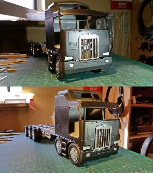 Zwischenzeitlich hatte ich dann auch die Kabine und die Sonnenblende, wieder verschliffen und das wurde nun zusammen mit der Stoßstange grundiert.