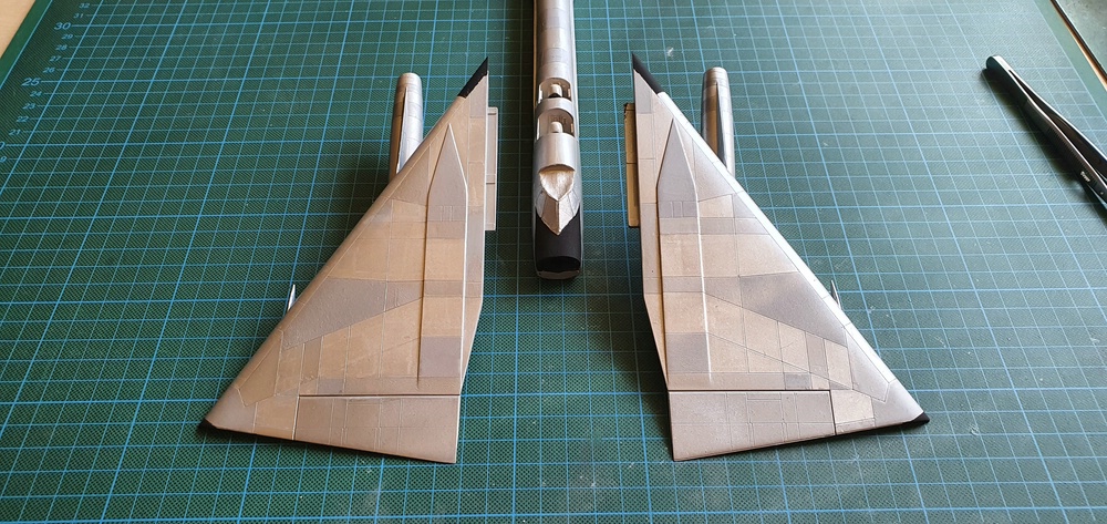 Die Flügelvorderkanten, oben zum Rumpf hin und die Flügelspitzen unten an den Enden, wurden mit Revell matt schwarz 9 lackiert.