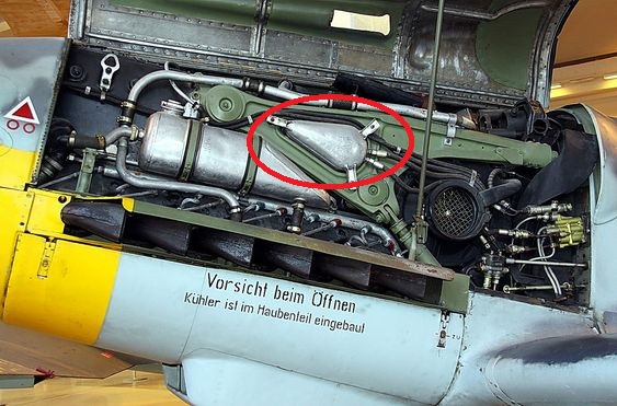 Nun zu deiner geschlossenen Seite des linken Motorträgers. Laut "Flugzeughandbuch" von 1941 der Messerschmitt AG ist dieses rot eingekreiste silberne Teil ein Ölbehälter für die "Druckölanlage". Diese Anlage ist für die Arbeitszylinder des Hauptfahrwerks, des Sporns und der Kühlklappen in den Tragflächen da. Also das Hydrauliksystem der Maschine.