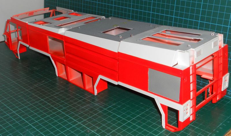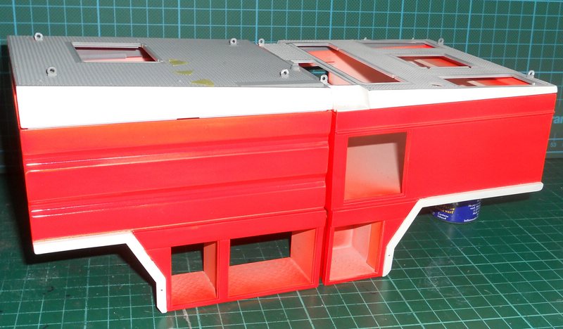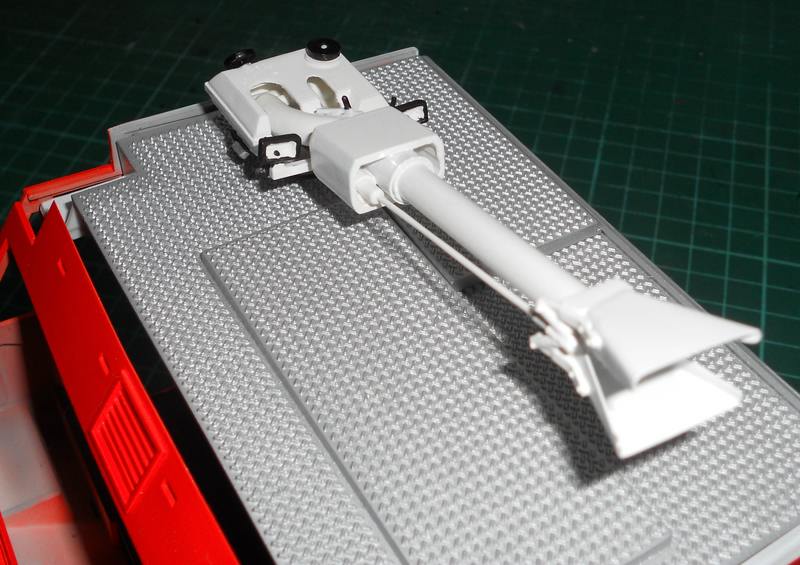Die Abschlußkappen (die Bezeichne ich jetzt mal so) liegen bereits bemalt daneben und können erst angebracht werden wenn das Dach bemalt und die Gitter eingesetzt wurden.