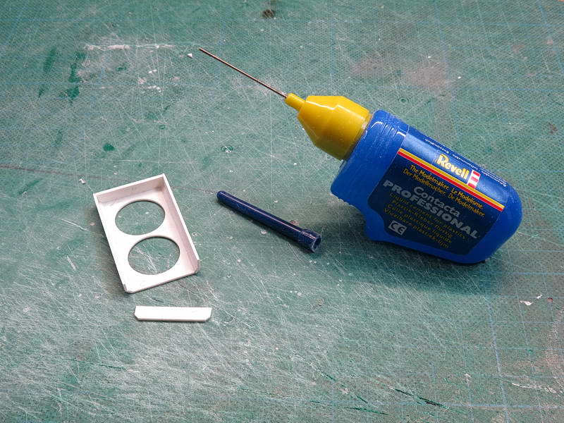 leicht angedrückt. Nachdem der Sekundenkleber getrocknet war, konnte ich den Tesafilm-Streifen abziehen und die PS-Streifen