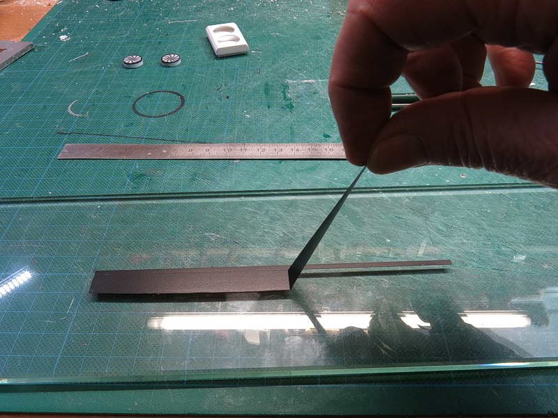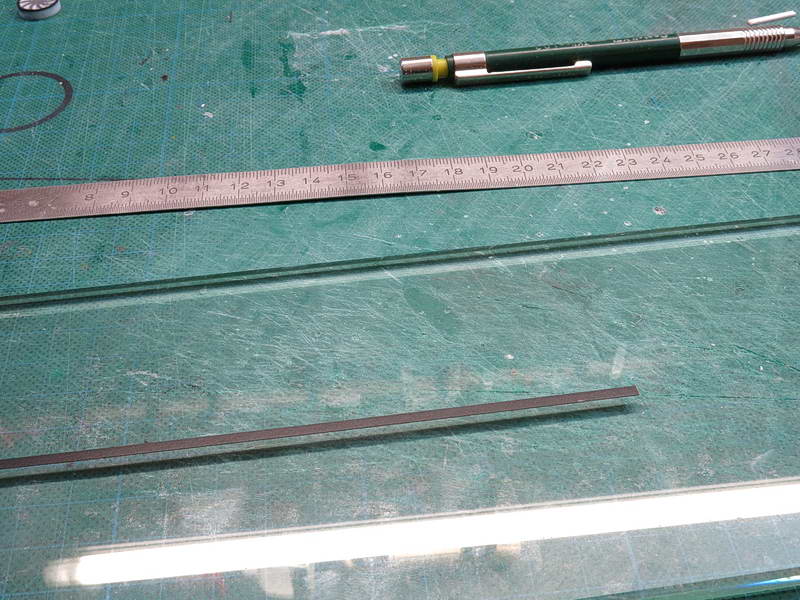 habe ich aus schwarzem Isolierband einen Streifen mit einer Breite von 2,5 mm ausgeschnitten und zwar auf einer Glasplatte.