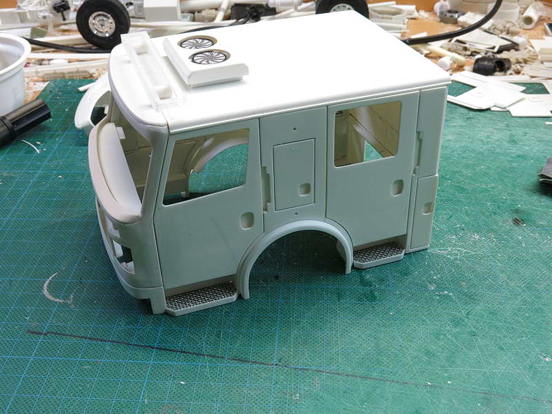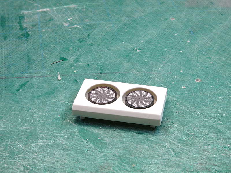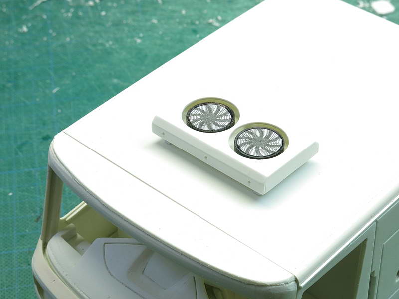 Nur eingesetzt nicht eingeklebt, da das Gehäuse der Klimanlage noch lackiert wird. Auch kommen oben auf die Abbildungen der Ventilatoren