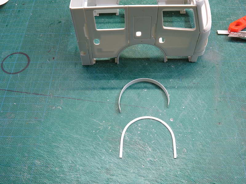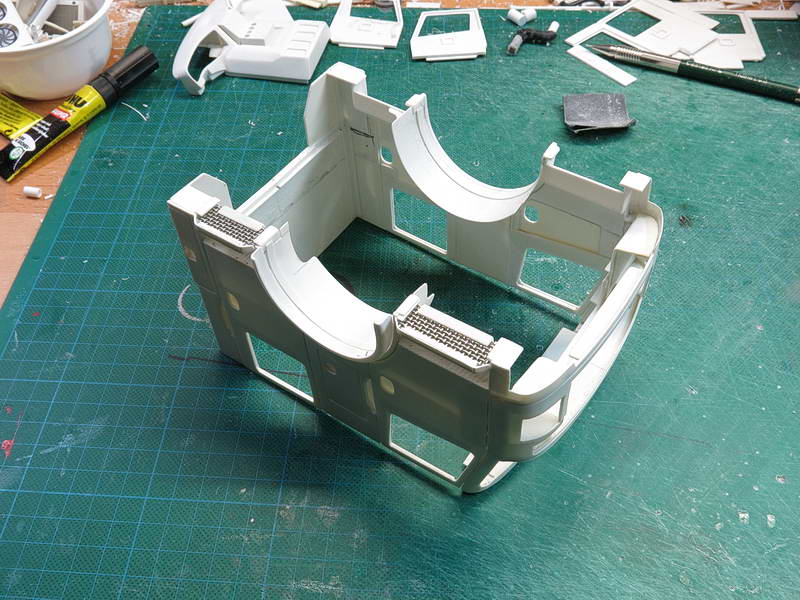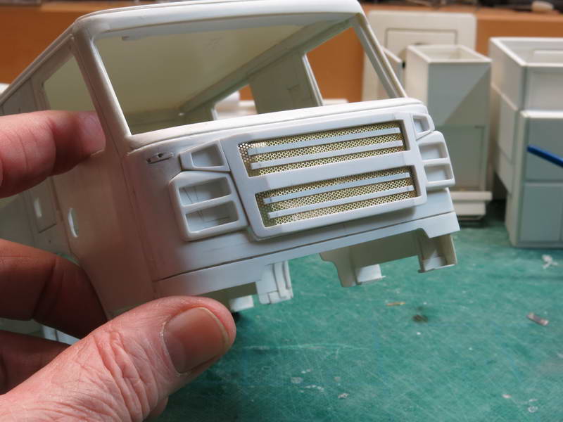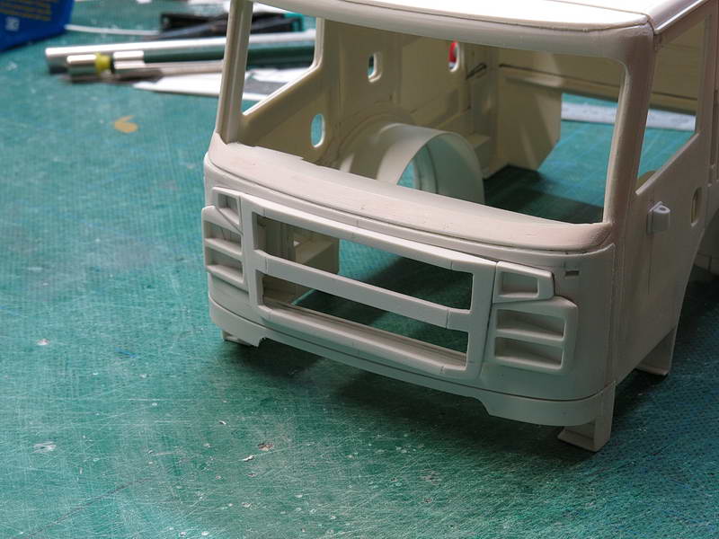 schon einiges ab. Anfangs hatte ich den Rahmen des Kühlergrills von Hand ausgeschnitten und zwar aus 1,5 mm PS. Nichts zu machen, ich habe das