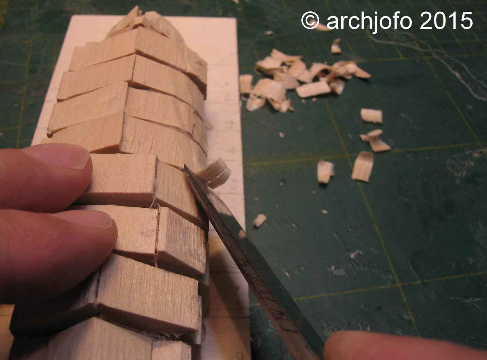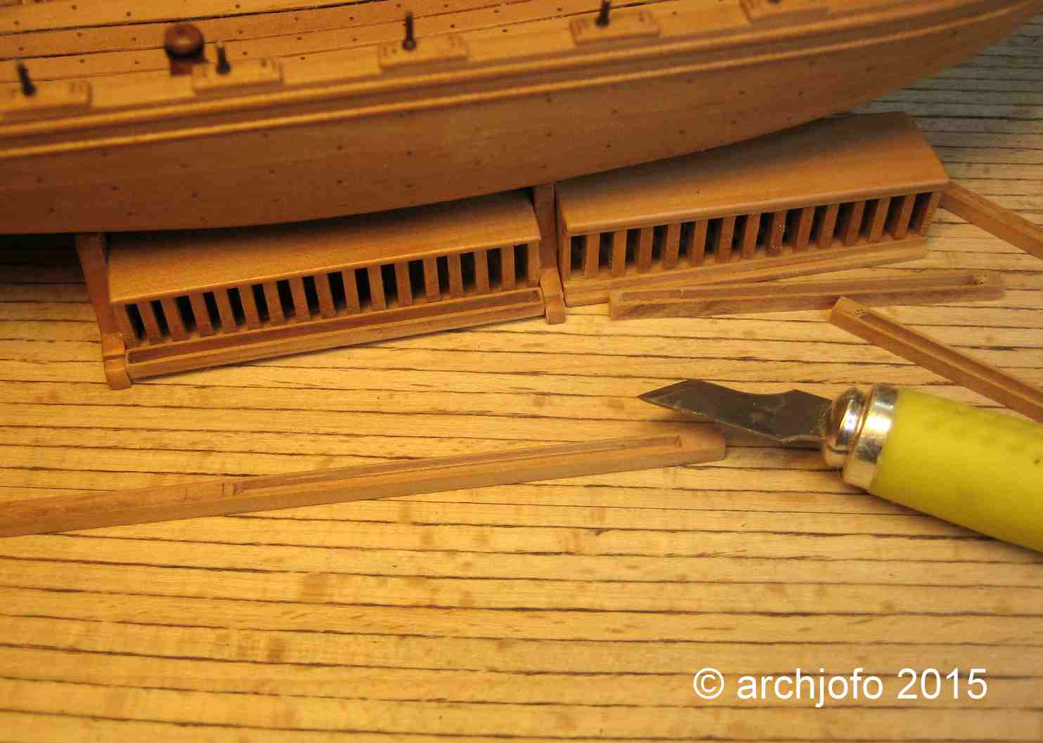Im Prinzip handelt es sich bei diesen Arbeitsschritten um die gleichen wie beim Bau der Schaluppe, nur die Bauteile sind kleiner und filigraner. So beträgt der Spantenquerschnitt nur 0,8 mm auf 0,8 mm.