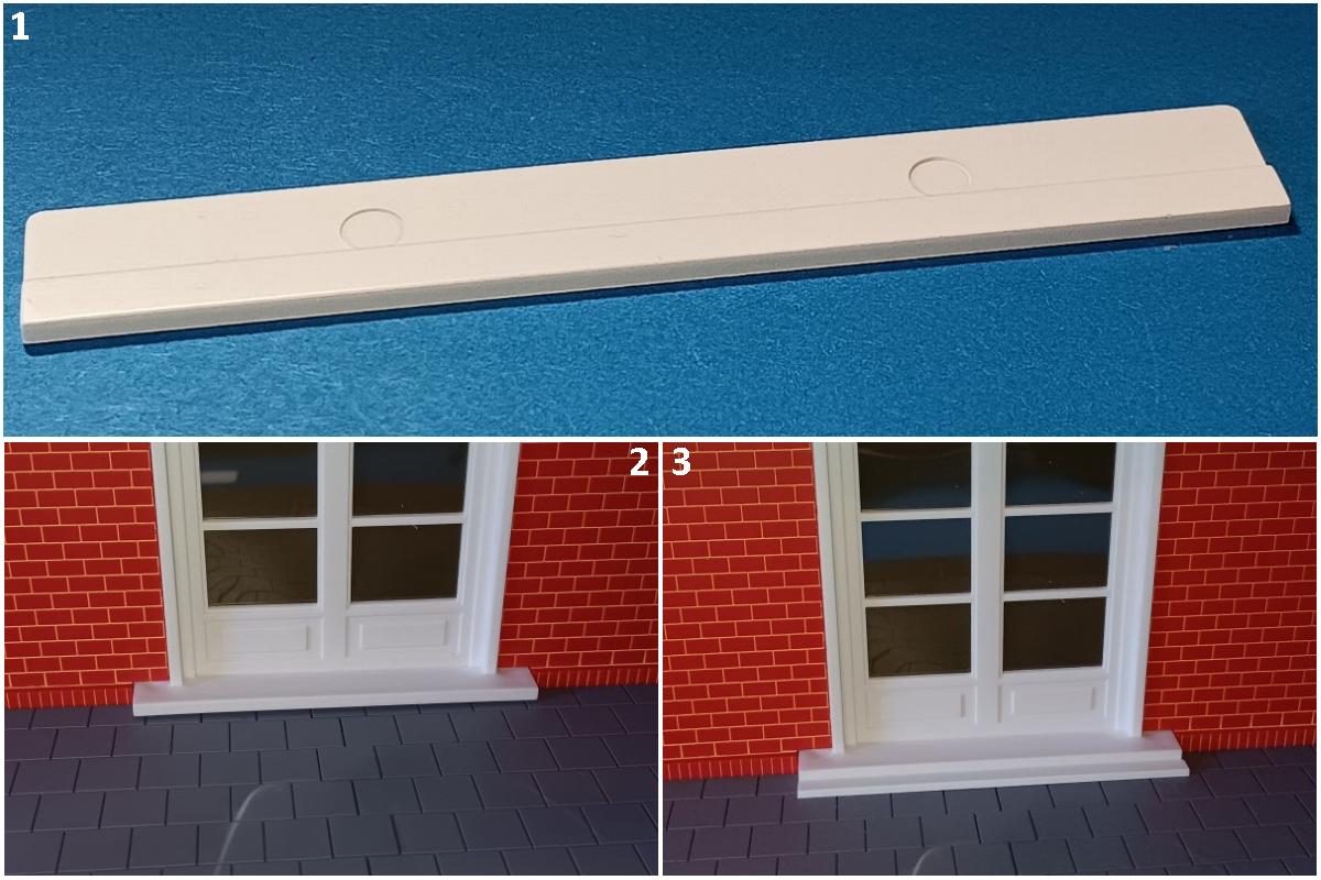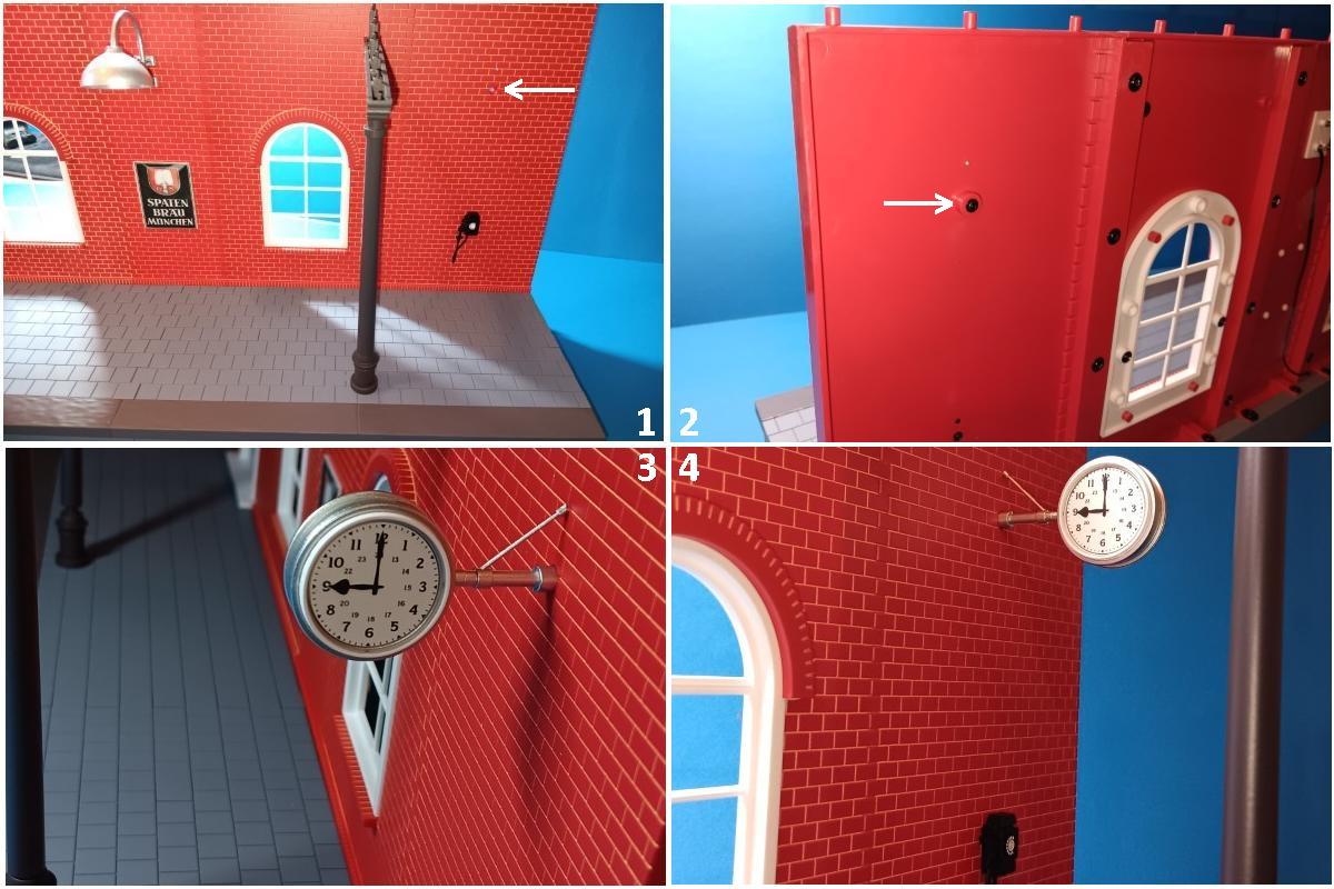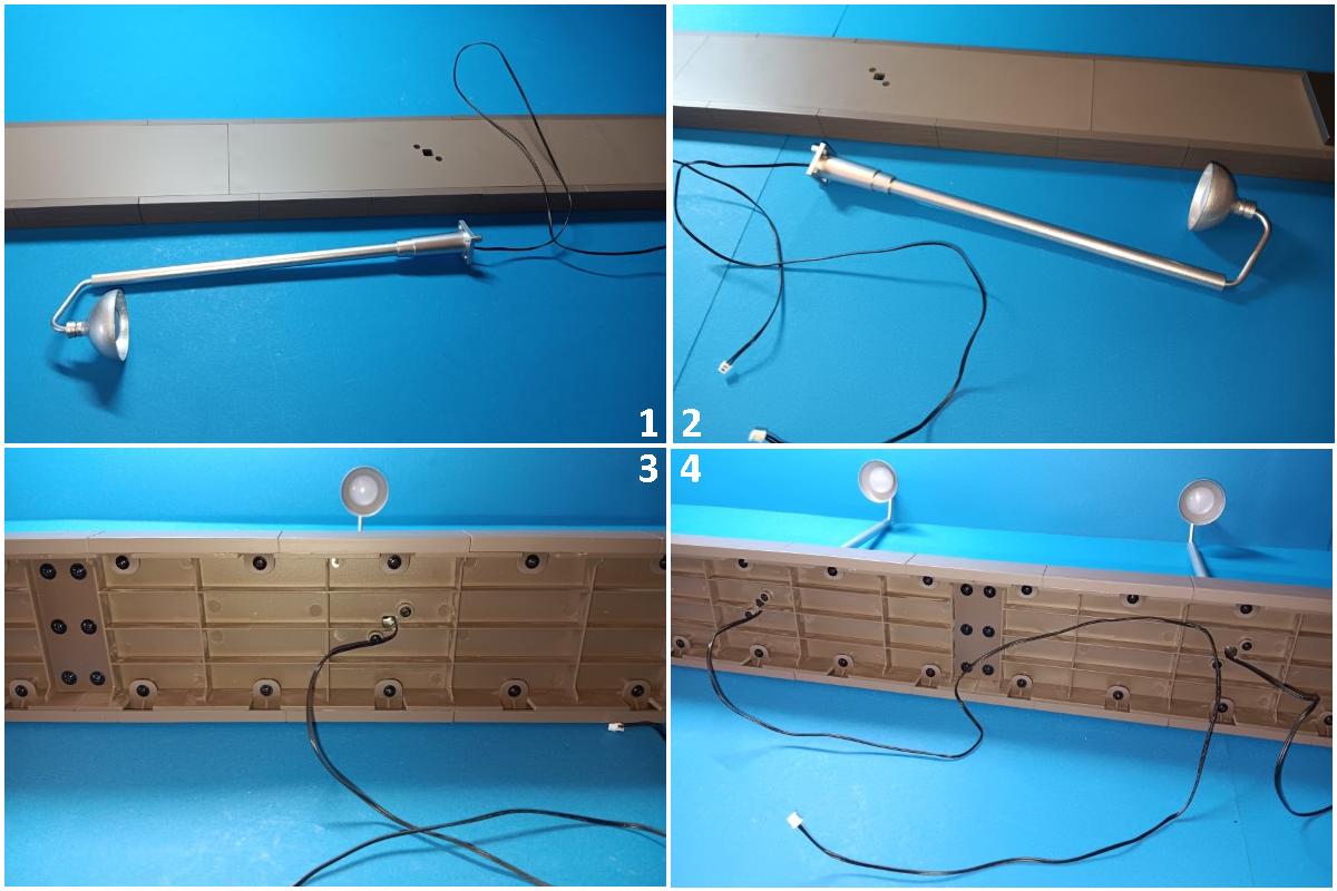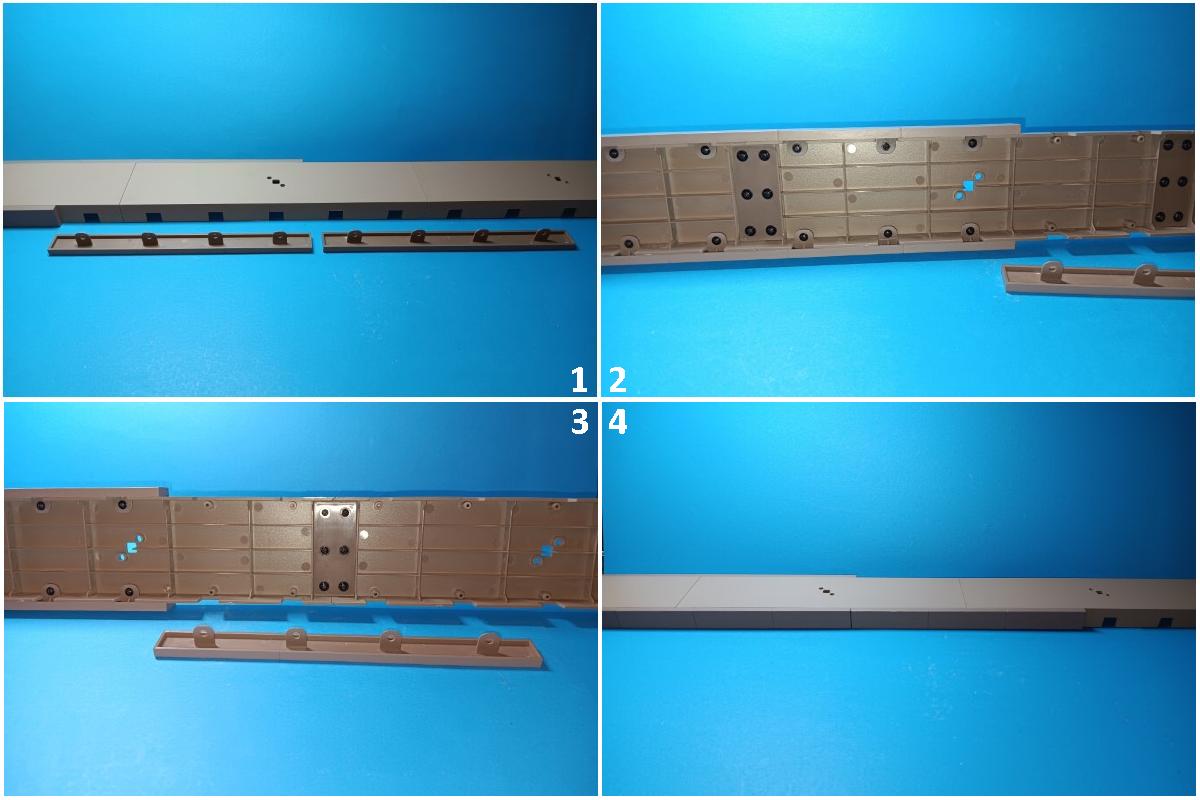 Wir legen uns die Seitenleiste und den Bahnsteigabschnitte auf unsere Arbeitsfläche ( Bild 1 ). Die Seitenleiste wird aufgesteckt und anschließend vierfach fest verschraubt ( Bild 2 + 3 ). Fertig ( Bild 4 )!