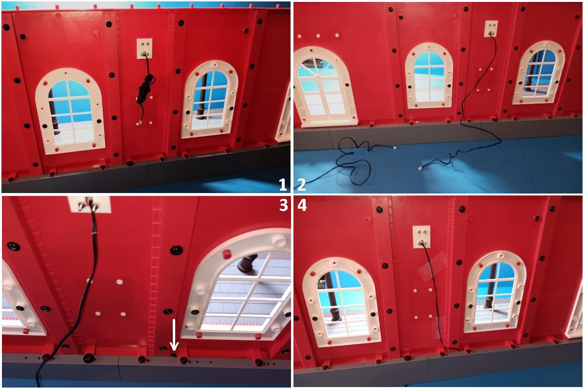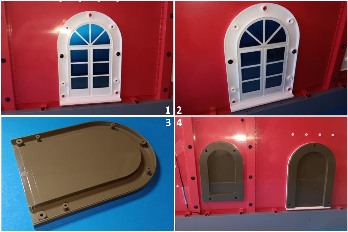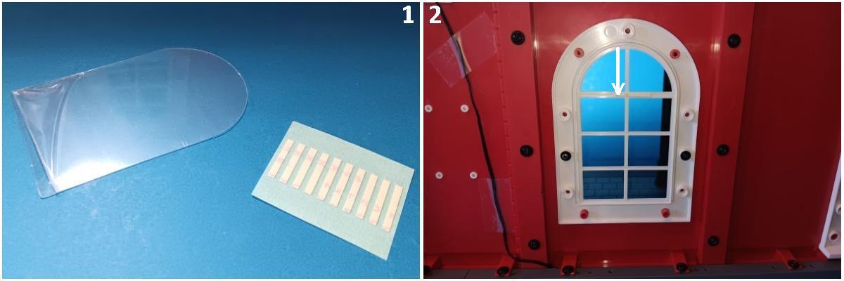 Nun kommen wir zu den letzten Bauteilen dieser finalen Lieferung. Dabei handelt es sich um das letzte zu verschließende Fenster ( Bild 1 ). Zuerst wird wieder ein doppelseitiger Klebestreifen auf die obere Fenstersprosse geklebt ( Bild 2 ). Im Anschluss entfernen wir die Schutzfolie vom Fenstereinsatz und kleben den ein ( Bild 3 ). Danach kann die Fenstereinfassung verschraubt werden ( Bild 4 ).