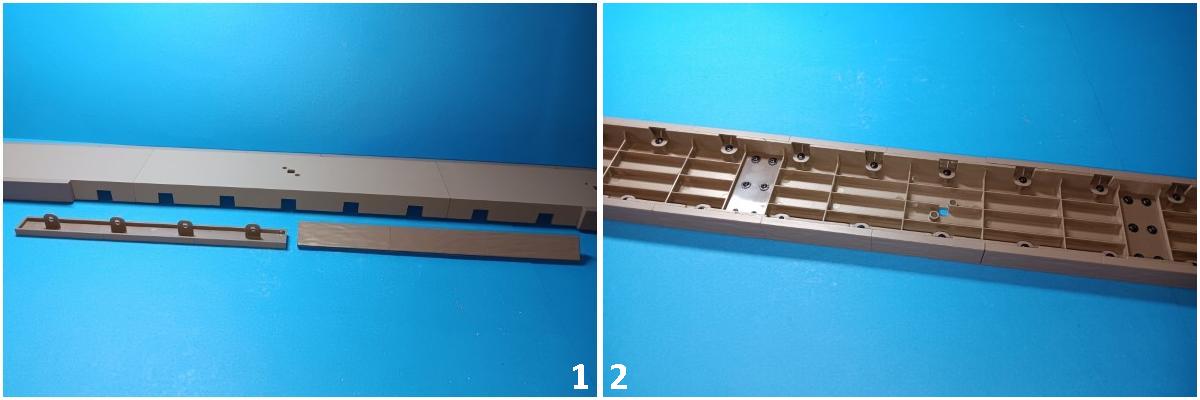 Wir nehmen uns die Dachbaugruppe aus den letzten Baustufen, den neuen Dachabschnitt und die Verbindungsleiste auf den Tisch.