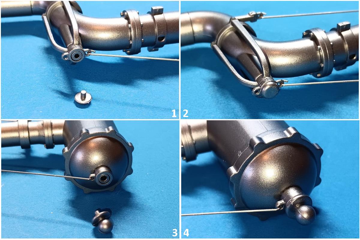 In die kleine Öffnung am Ausleger kleben wir die kleine Abdeckkappe ( Bild 1 + 2 ). Die große Abdeckung kleben wir in die Bohrung des gro0en Deckels ( Bild 3 + 4 ).