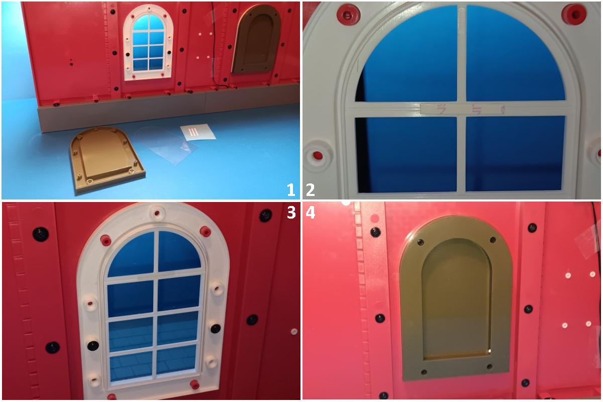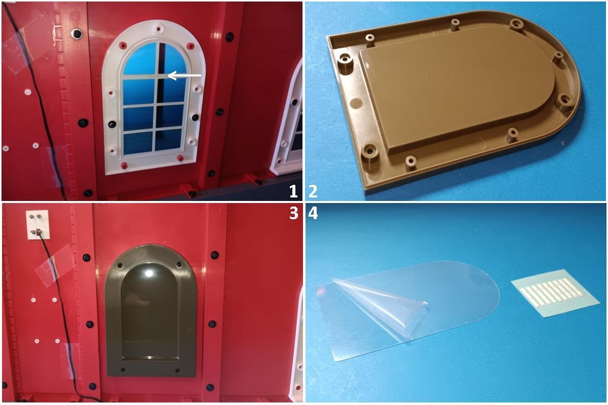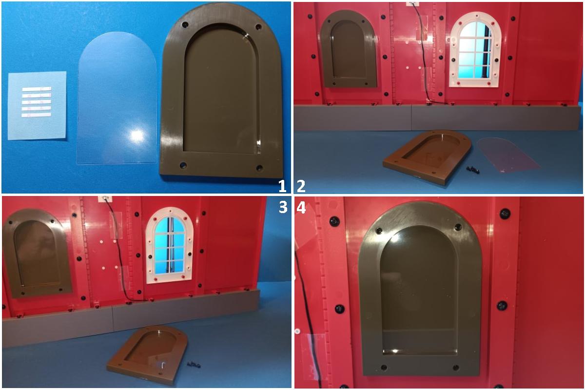 Der Fenstereinsatz wird auf den Klebestreifen gedrückt ( Bild 1 ) – hält!Danach nehmen wir die Fenstereinfassung ( Bild 2 ) und verschrauben diese vierfach mit dem Fensterrahmen ( Bild 3 ). Nun legen wir uns das Fenster und die Klebestreifen für die Tür bereit. Die Schutzfolie ziehen wir auch hier ab ( Bild 4 ).