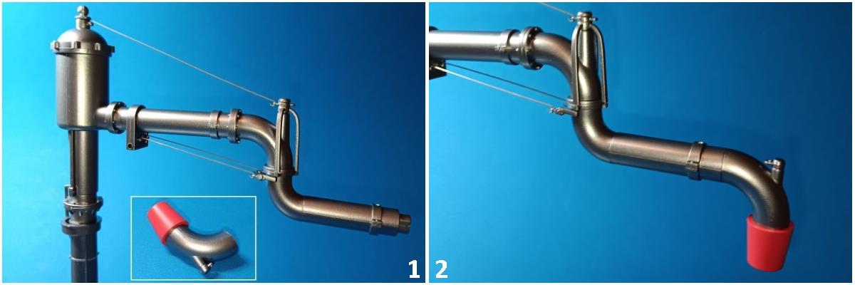 Nun kommen wir wieder zum Wasserkran, welcher nun komplettiert wird. Dazu stellen wir diesen wieder auf die Arbeitsfläche und nehmen den Wasserauslass dazu ( Bild 1 ). Das Teil wird in die Öffnung des Auslegers geschoben und mit ein klein wenig Sekundenkleber fixiert ( Bild 2 ).