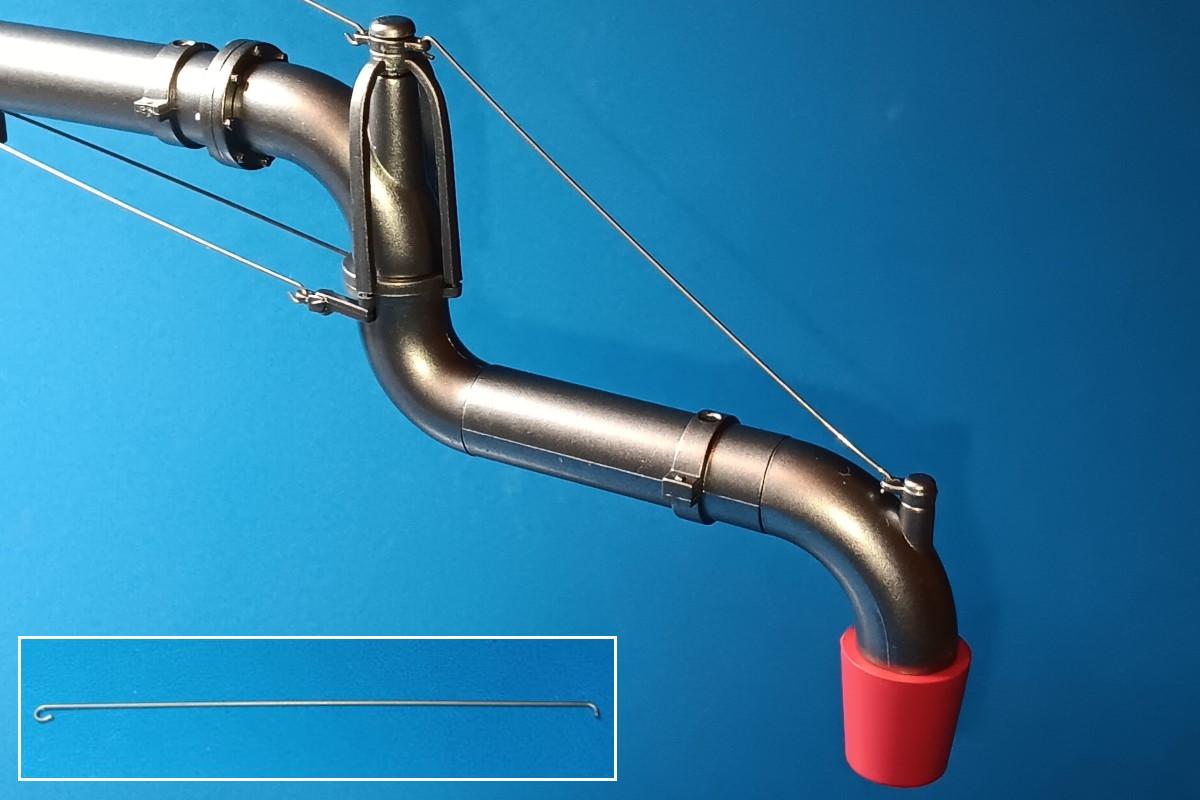 " ... Das obere Ende wird in die zugehörige Bohrung ( weißer Pfeil – Bild 3 ) eingeschoben und verklebt. Danach kann der Zugdraht" da fehlt glaube ich etwas. Super Baubericht
