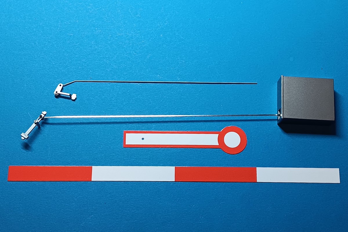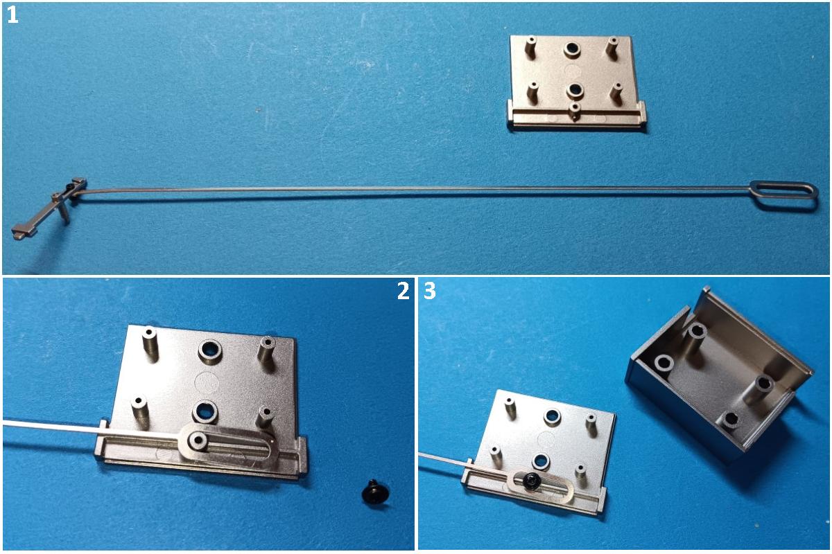 Nachdem der Wasserkran fertig ist, wenden wir uns dem Signal zu. Dazu brauchen wir die Betätigungsstange und die Grundplatte ( Bild 1 ). Die Stange wird mit einer Schraube fixiert ( Bild 2 + 3 ). Der Abdeckkasten liegt auch schon bereit.