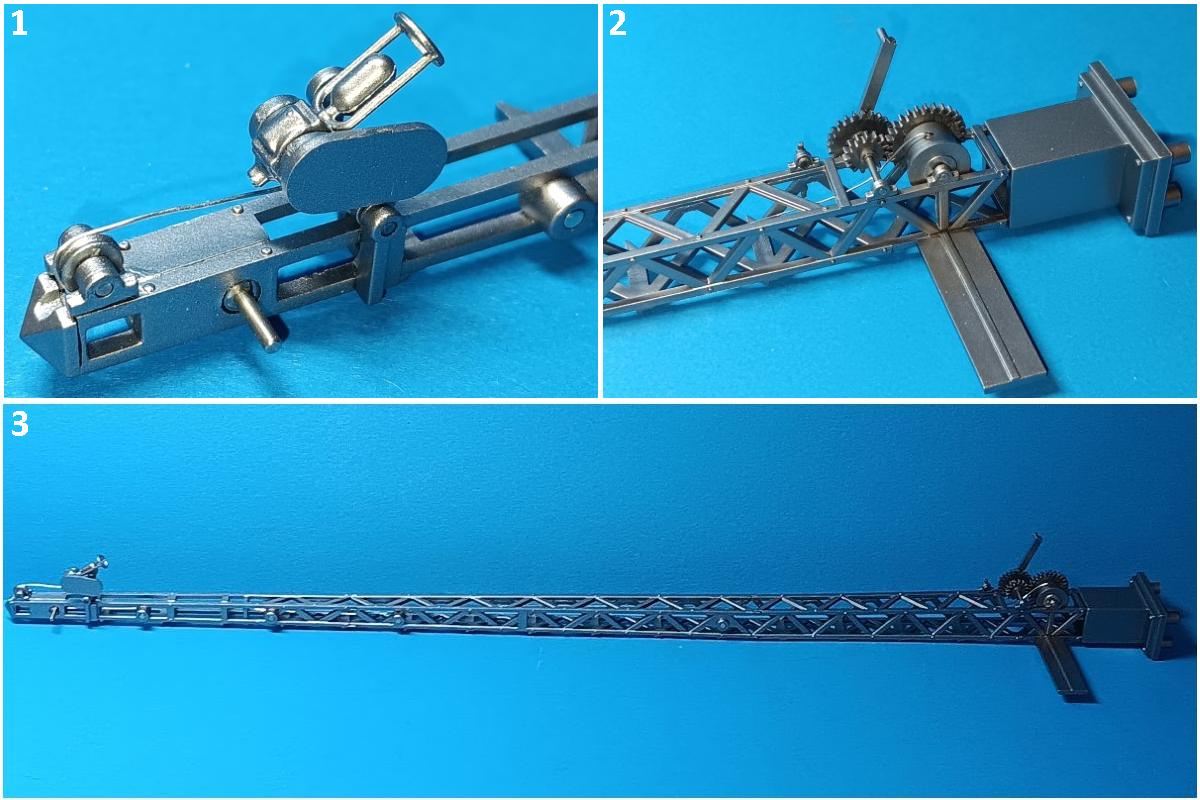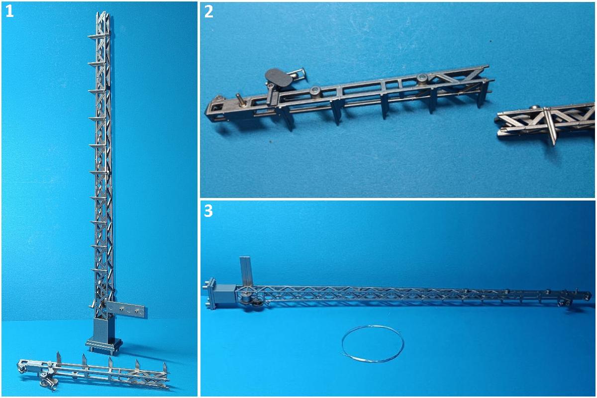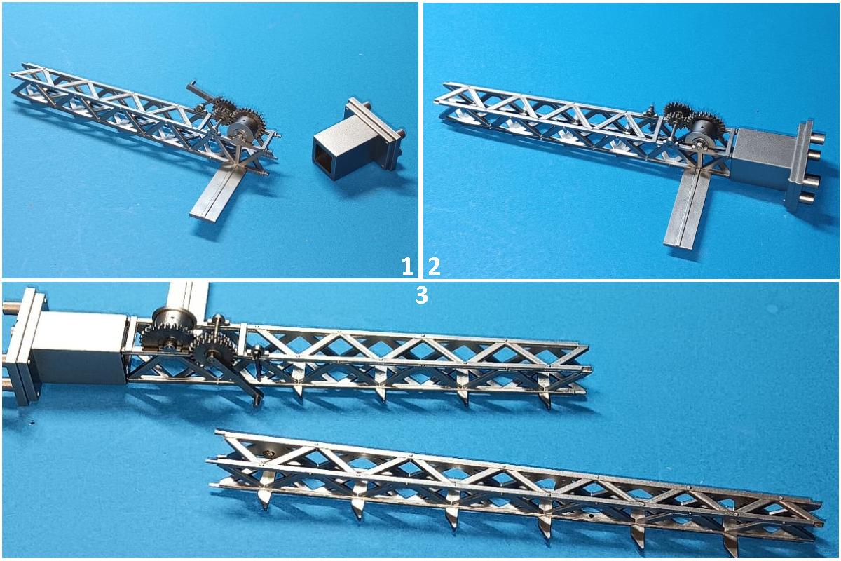 Wir nehmen die vordere Plattform hinzu ( Bild 1 ). Der Signalmast soll nun mit vier Schrauben darauf befestigt werden ( Bild 2 ). Der Mast ist verankert ( Bild 3 ) Die Kurbel muss zu kurzen Seite und der Ausleger für den Mastantrieb zur langen Seite der Plattform zeigen. Wir drehen die Plattform um und nehmen den Kasten des Antriebs hinzu ( Bild 4 ). Dieser wird auf die beiden Zapfen am Halter aufgepresst.