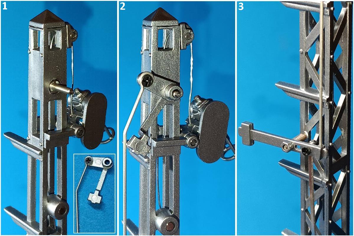 Nun wird die zweite Betätigungsstange ( Bild 1 – Bild im Bild ) auf den Zapfen am oberen Ende des Mastes aufgeschoben ( Bild 1 + 2 ). Das untere Ende der Stange wird in der Bohrung des Umlenkhebels eingesteckt und verklebt ( Bild 3 ).