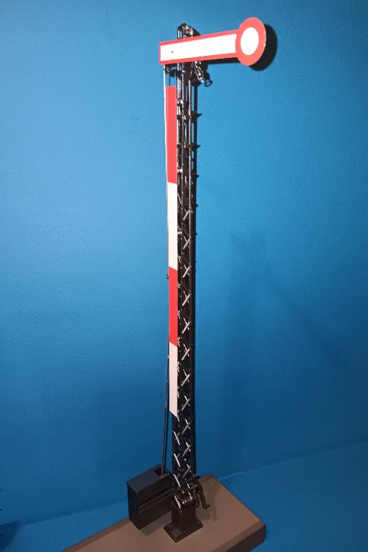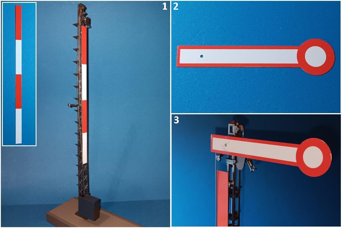 Nun nehmen wir das Mastschild dazu. Dieses ist aus Metall und wird einfach seitlich durch insgesamt vier im Mast integrierte Magnete gehalten ( Bild 1 ). Der Signalflügel ( Bild 2 ) wird nun waagerecht auf dem zugehörigen Zapfen geklebt ( Bild 3 ). Achtung: die gesamte Signaleinheit ist starr und nicht beweglich konstruiert! Auf den Zapfen gehört laut Bauplan noch eine Fixiermutter, das gefiel mir aber nicht, darum habe ich diese einfach weggelassen!