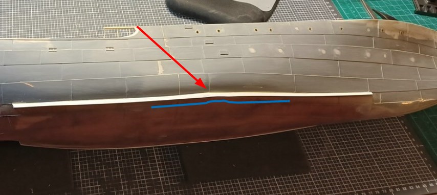 Die mit dem Pfeil markierte Stelle ist schon in der Form gegeben, da kann ich nicht mehr viel ändern. Ich hatte schon zwei Streifen 0,3er Poly über den Bausatz-Schlingerkiel geklebt (Erinnerung), das hat eine Verbesserung gebracht. Nur habe ich Dösbaddel beim Umgreifen während des Lackierens nicht aufgepasst und meinen Daumen genau auf diesen Streifen gesetzt. Daher kommt jetzt die Delle (blaue Linie). Das werde ich durch einen weiteren Streifen wieder richten.