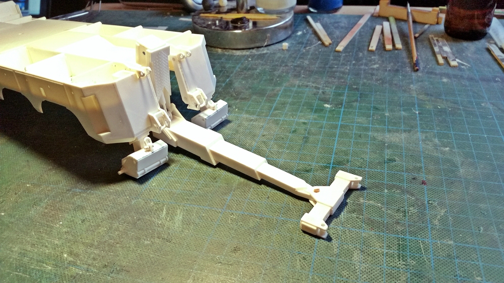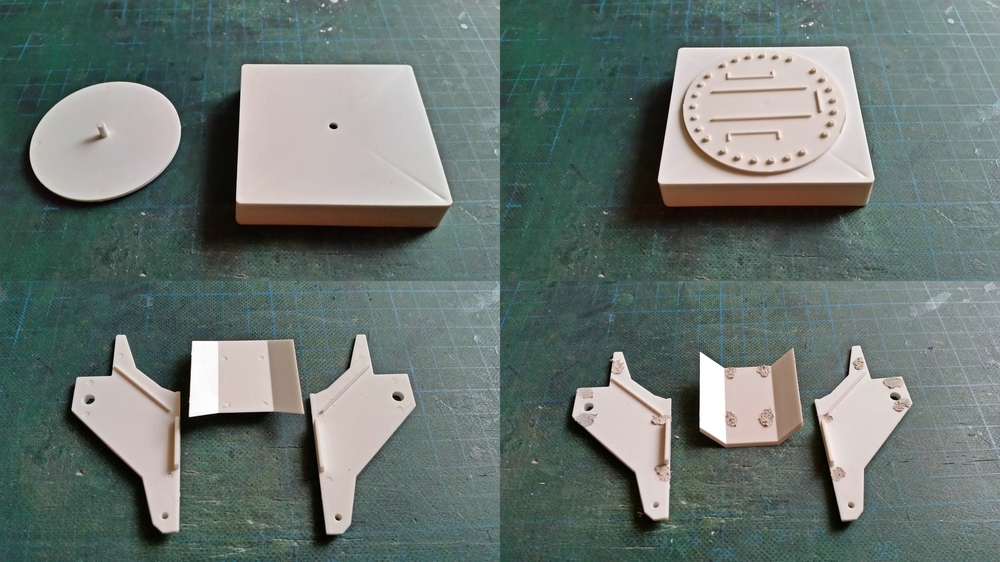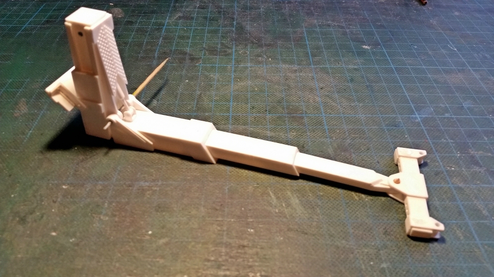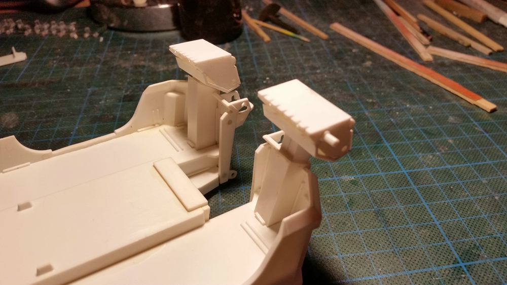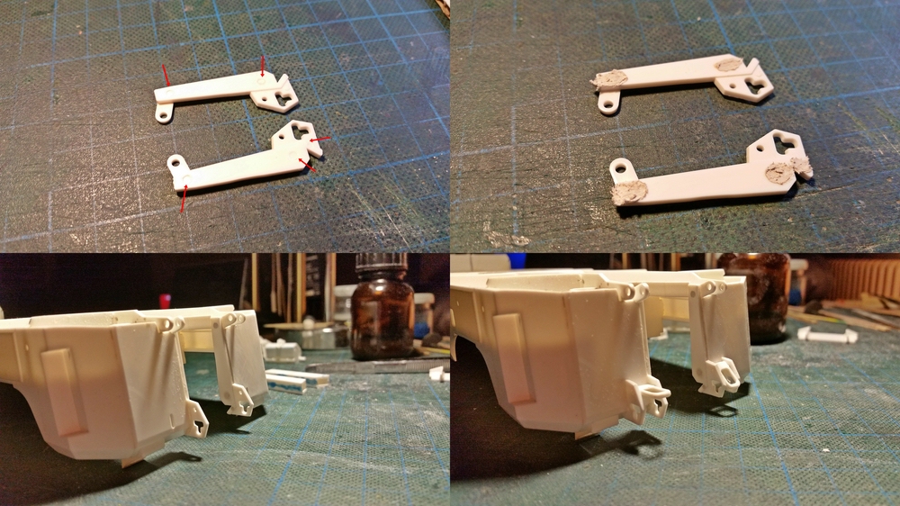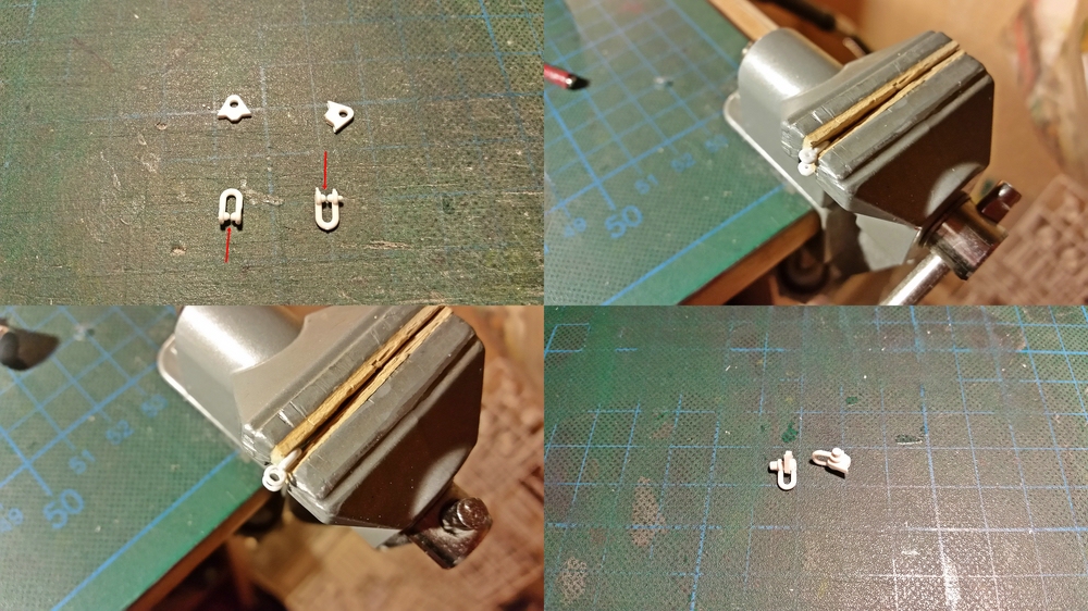 Dazu hier zwei Teile, die später am Heck angebracht werden, diese wurden gespachtelt und geschliffen, dann angeklebt. Unten kamen dann noch bewegliche Ösen dazu, die mit zwei weiteren Teilen befestigt wurden.