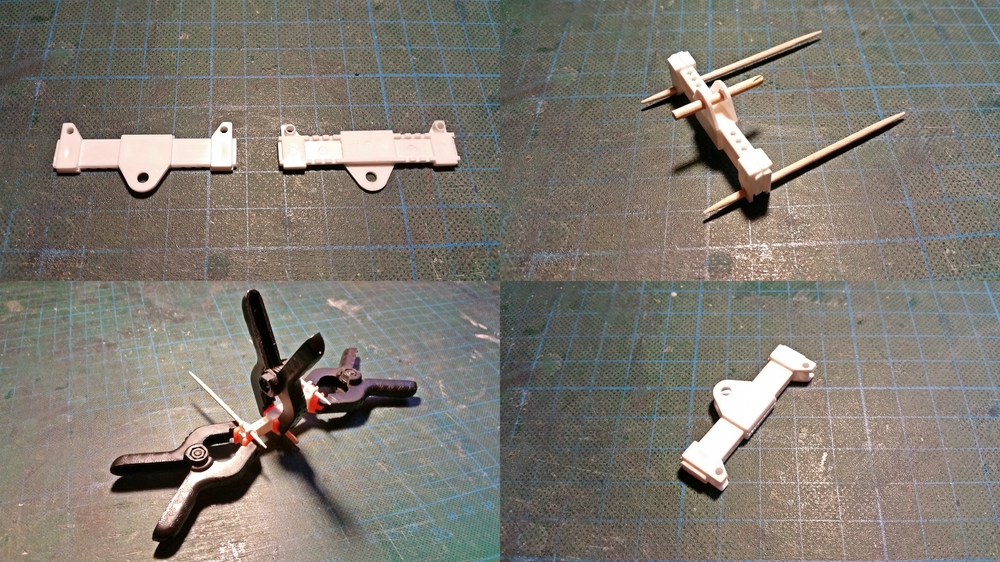 Die Schäkel sollen eigentlich nur in die Halteplatten ein geclipst werden, was mir allerdings etwas suspekt ist, da sie so zu Verlustkandidaten werden. Also entweder festkleben, oder umbauen, klar wofür ich mich entschieden habe, umbauen.