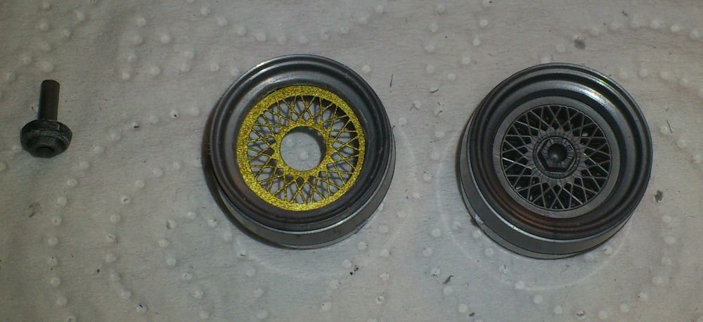 Ich habe mich weiter mit den forderen Felgen beschäftigt. Ich habe sie mit Alclad II, poliertes Alluminium beschichtet. Die Speichen habe ich entfernt und durch ein Fotoätzteil ersetzt.