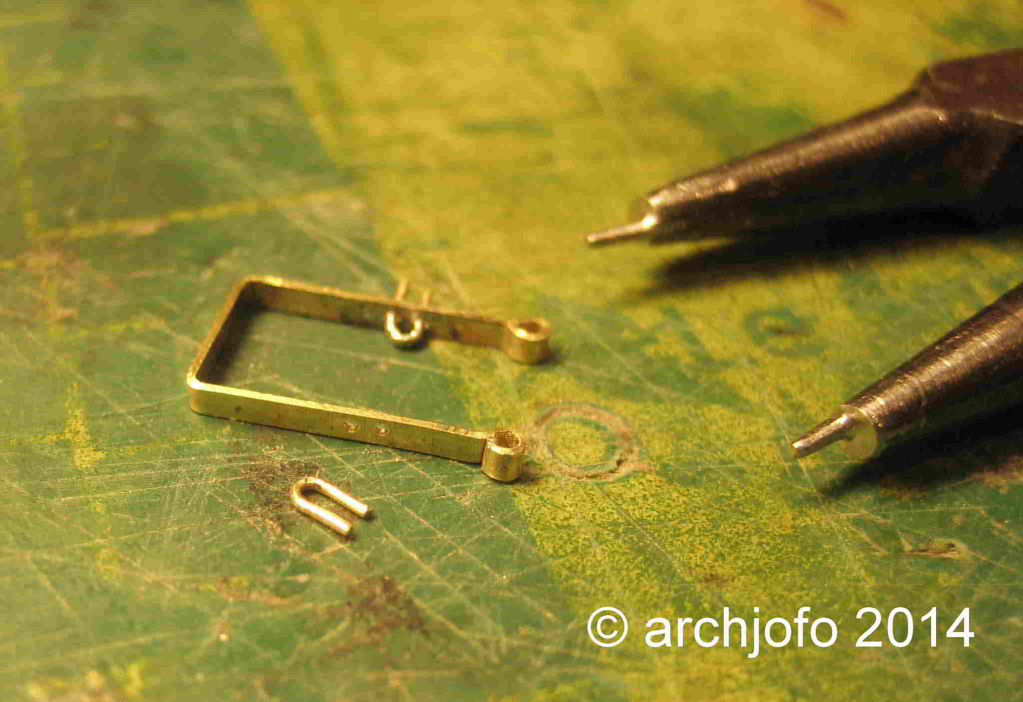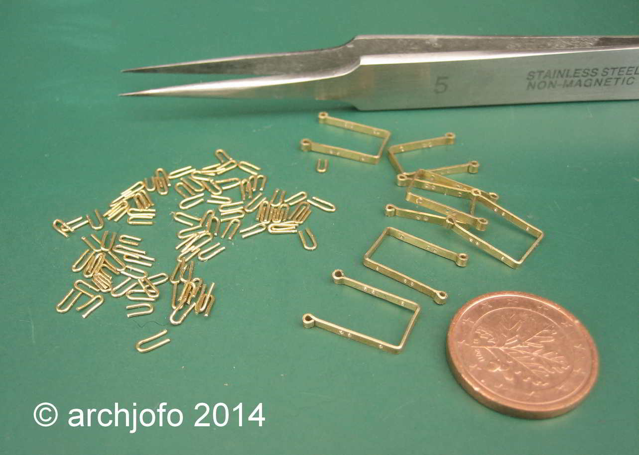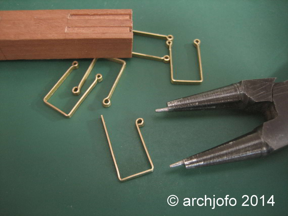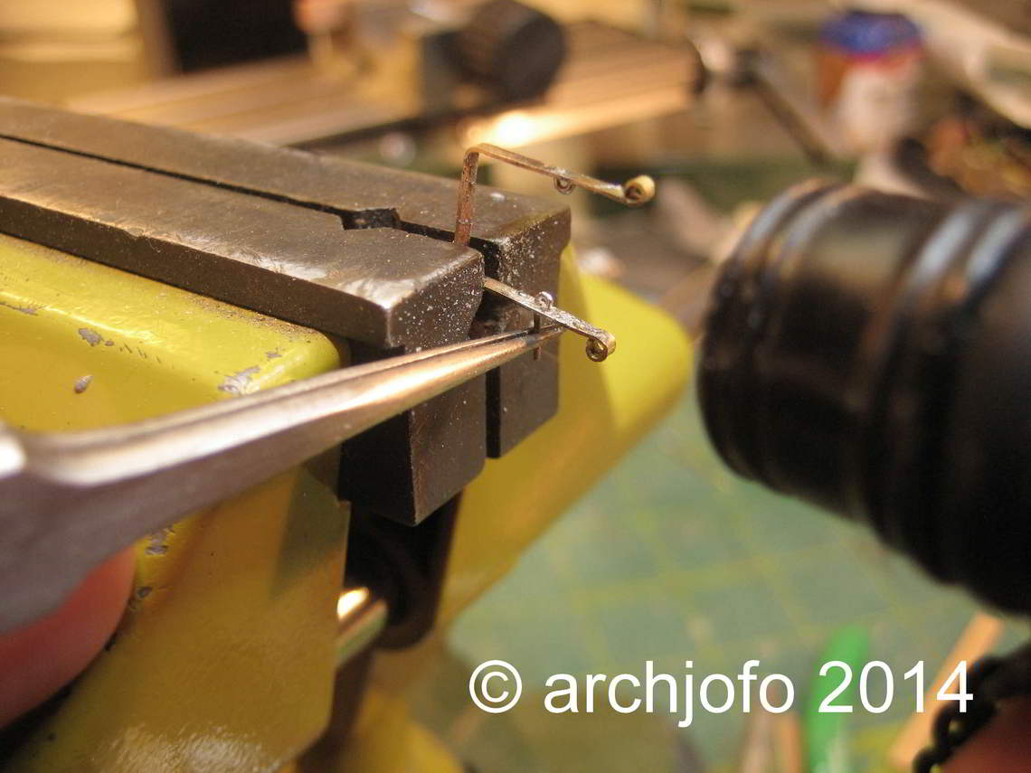 Gebogen werden die Ösen mit einer präparierten Spitzzange. An die Enden einer alten Zange feilte ich mit einer flachen Nadelfeile Rundungen mit einem Durchmesser von max. 0,6 mm. Mit dieser Zange lassen sich auch ganz kleine Augbolzen und Ringe in exakter Ausführung herstellen. Dies nur als Anmerkung in diesem Zusammenhang.