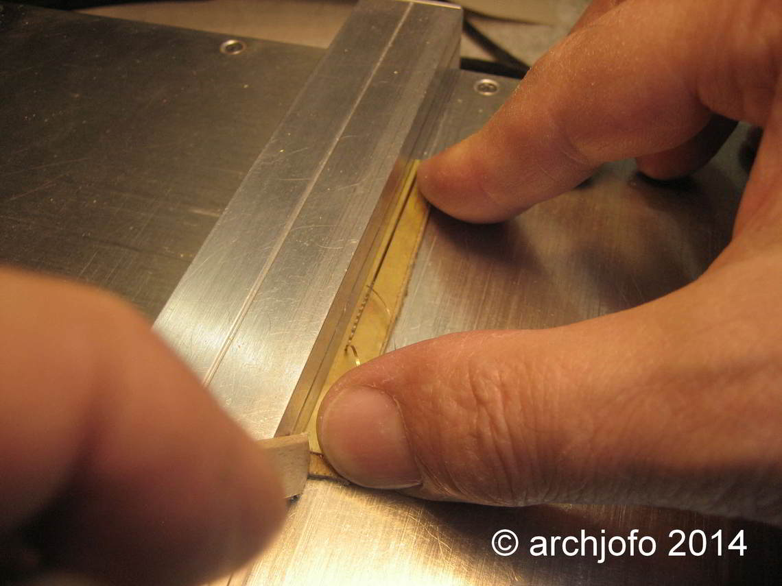 Das Formbiegen der Finknetzhalter erfolgt mit einer Lehre, die ich aus einer Birnbaumholzleiste angefertigt habe. In diese Holzleiste, dessen Breite genau dem Innenmaß des Finknetzkastens entspricht, wurden Nuten in der Tiefe der Blechdicke gefräst. Pro Schenkel ergibt sich die Länge unter Berücksichtigung der notwendigen Abwicklung für die später zu biegende Öse.