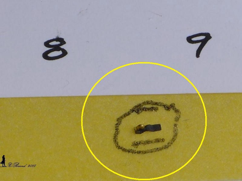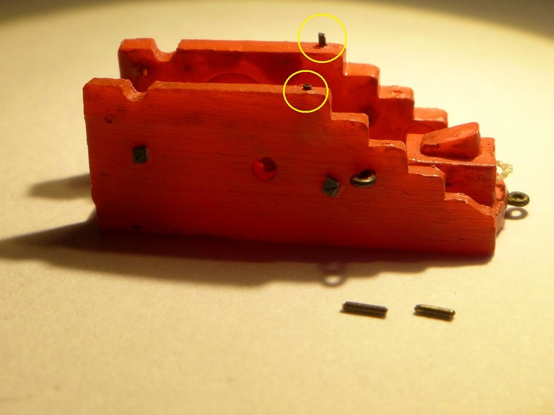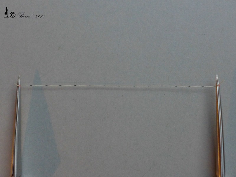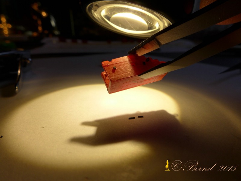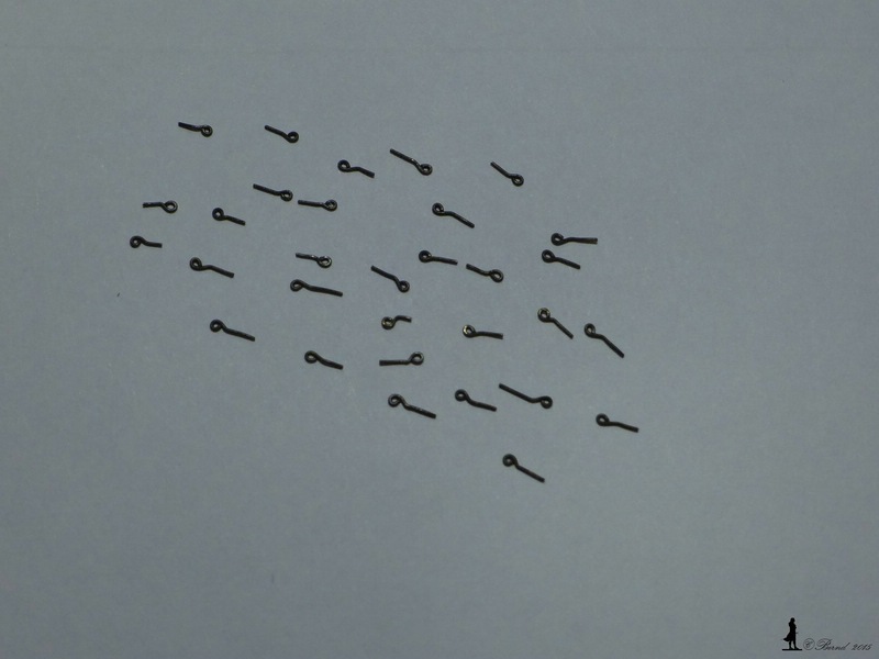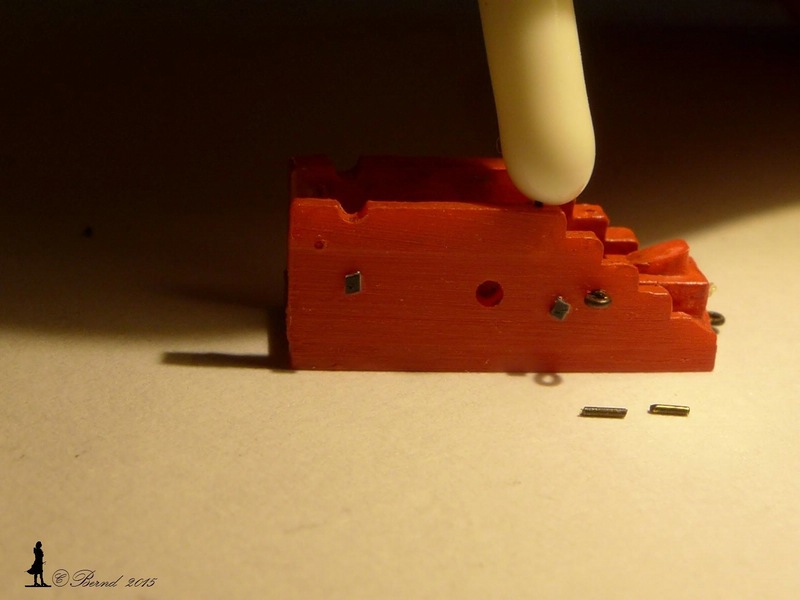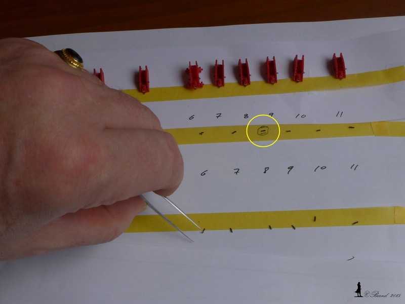 Nun ein kleiner Schwenk zur Abteilung Beschlägeproduktion. Hier haben wir die Augbolzen aus 0,2 mm Draht für die Seitentakel, die zur Verzurrung der Geschütze benötigt werden und deutlich kleiner sind als die Ausführungen in den Lafettenwänden. Die Größe wollt ihr nicht wirklich wissen... :D