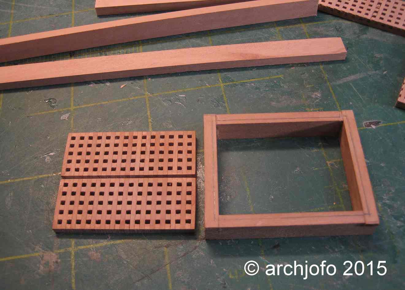 Hier nun die Fortsetzung dieser Arbeiten. Nach der Herstellen, der entsprechenden Zahnleisten an der Fräse mit den senkrechten „Gitterstäben“, werden diese zu Gittern zusammengesetzt. Bei der La Créole waren 4 Kleintierställe (Hühner und Geflügel), zwischen den zwei Grätings angeordnet. Also werden insgesamt 8 Gitter benötigt.