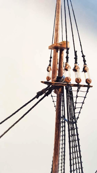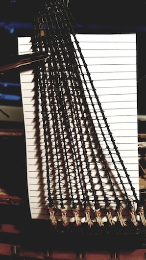 Im unteren Bereich der Wanten, in dem Die Webeleinen noch länger sind, lässt sich der Durchhang darstellen, weiter oben nicht, dort liegen die Koten fast direkt aneinander,