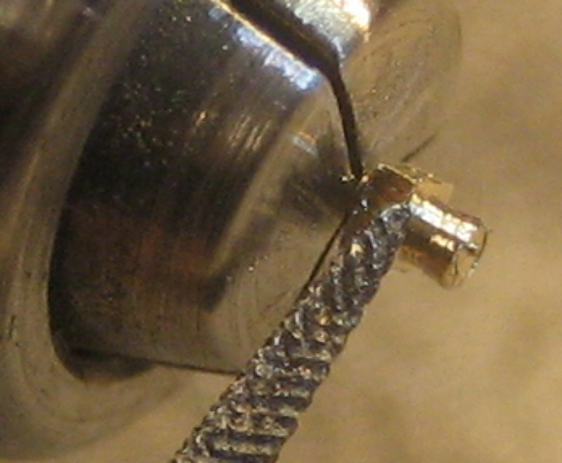 So verwendete ich einen Proxxon-Bohrfräser mit einer Spannzange. An einem schnell hergestellten Messingvierkant 1,0 mm /1,0 mm „drehte“ ich so einen Schaft mit etwa Ø 0,5 mm. Das Reststück bleibt als Vierkant stehen. Sicherlich ginge es mit einem Dreheisen an der Unimat SL besser, aber wie bereits gesagt, ich improvisierte.