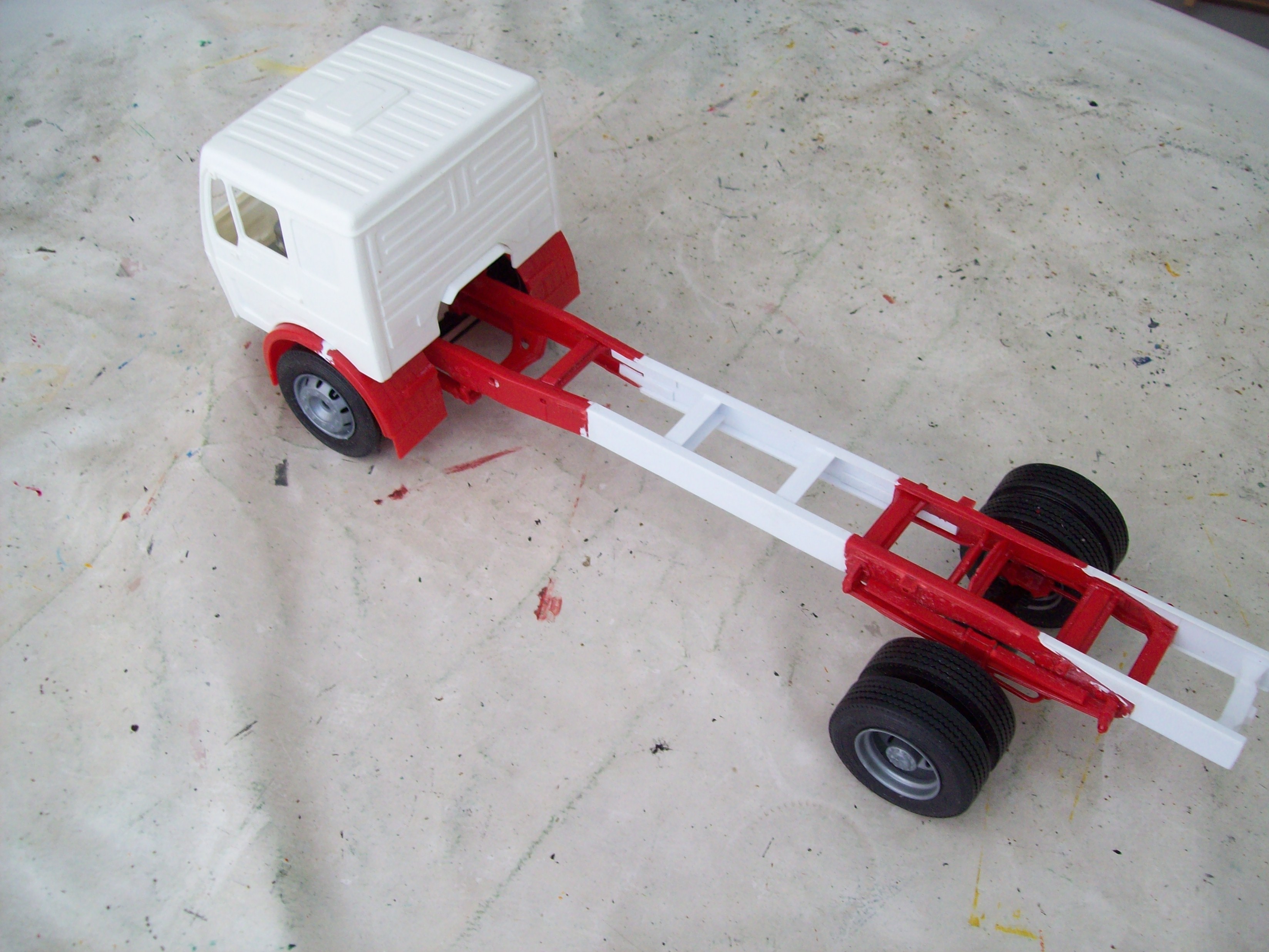 Immerhin ist der Rahmen an sich mal fertig, die Achsen (Italeri) sind da; Lenkung muss noch gemacht werden.