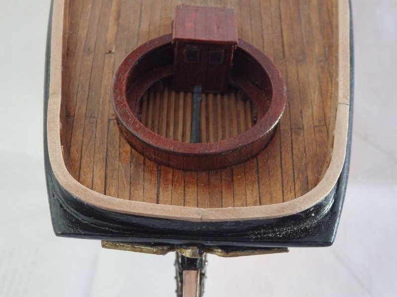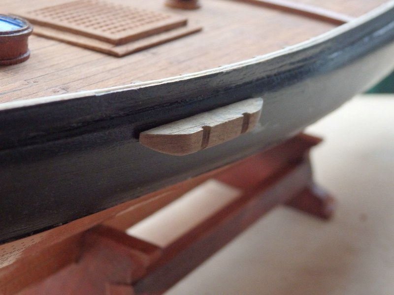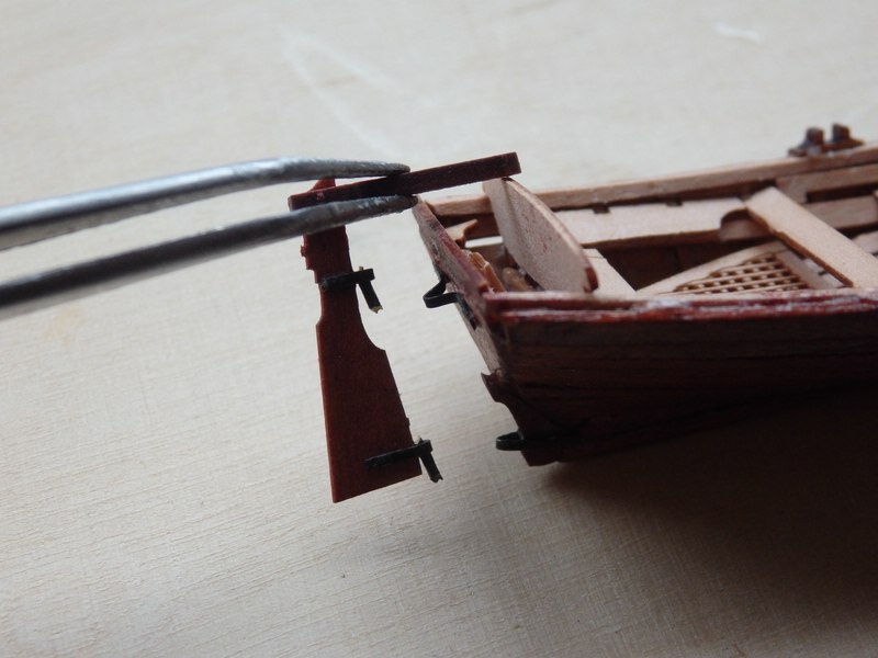 Der heutige Stand: Handläufe, Rüsten für den Fockmast sowie Ruder angebracht, Spriet abgelängt und konisch geschliffen. Das Ruder hat Probleme bereitet, weil die Beschläge nicht über den Rumpf passten. Beim Versuch, sie abzuschleifen und "hinzubiegen", brachen die rumpfseitigen Bänder ab. Ich habe die Bandlaschen abgeschliffen, sie mit Sekundenkleber auf ein Stückchen 1 x 2 mm Planke geklebt und am Heck befestigt. Danach wurden die abgeknickten Bänder seitlich mit Pattex angeklebt. Sieht man nur, wenn man's weiß. :baeh: Die beiden "Streamline-Rüsten" wurden aus einer 5 x 5 mm Leiste geformt und sind mit Stiften an der Bordwand befestigt. Wenn ich sowas mache, dann sitzt immer eine Seite sehr gut und bei der anderen addieren sich meine Messfehler. Die Steuerbord-Rüste saß schief, weil ich das Loch in der Bordwand um 0,1 mm zu tief und die Bohrung in der Rüste um 0,1 mm zu hoch gebohrt hatte. :bang: Na ja, irgendwie konnte ich's gerade rücken.