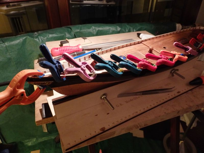 Die zahlreichen Spanten brechen beim Beplanken oberhalb der Malle leicht ab. Man benötigt sie nicht alle, um die Abschlussplanken zu setzen, kann die fehlenden Stücke aber leicht ersetzen. Wie die nachfolgenden Bilder zeigen, werden die Spanten mit einer Leiste abgedeckt. Schwierig gestaltete sich das Ablösen der Malle, ich habe sie schließlich mit einem Fräser zerkleinert. Problematisch war für mich auch, dass es fast keine Möglichkeit gibt, um Klemmen anzusetzen.