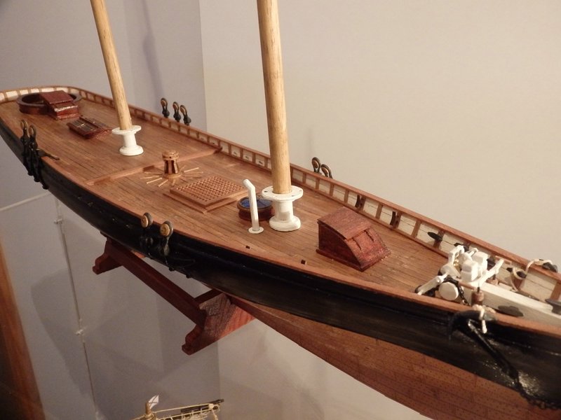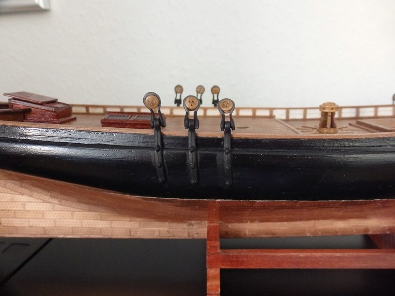Was gerne vergessen wird, waren die Festmacher. Die Photos vom Civil War zeigen am Bug und am Heck jeweils Lippen auf der Reeling (so Führungen) und man kann davon augehen, dass die Festmacher an Kreuzhölzern befestigt wurden - so wie das Revell-Modell welche mitschiffs hat.