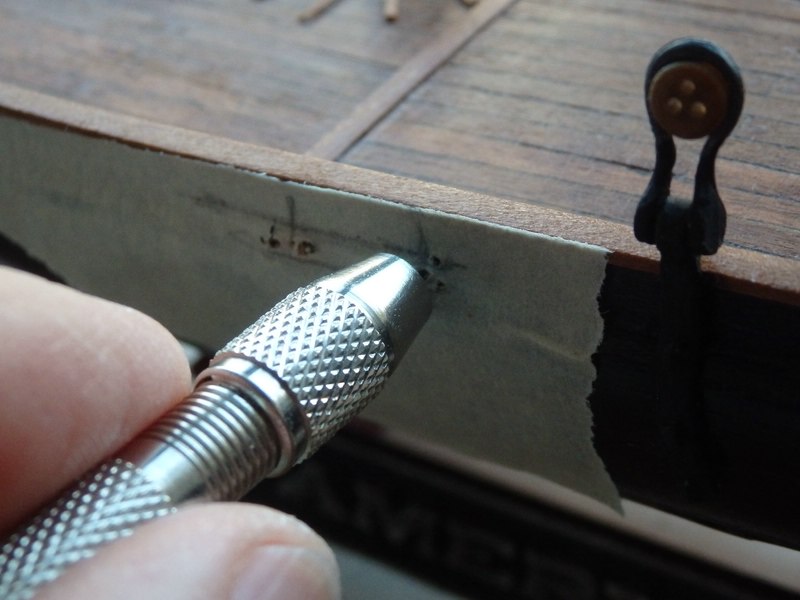 Wie schon mehrmals angekündigt, möchte ich jetzt ein paar Löcher ins Schanzkleid bohren. Davor habe ich etwas Bammel, denn die Speigatten sollen ja hinterher auf einer Linie sitzen. Ich gehe mal davon aus, dass diese "Spundlöcher" direkt über dem Wassergang liegen müssen. Sollte ich von außen oder von innen bohren? Wäre eine Führung (für den richtigen Neigungswinkel des Bohrers) hilfreich? Müssen die Speigatten innen höher liegen als außen? Bei meinem Modell würden sie dann in dem nach außen gewölbten, verstärkten Rumpfbereich heraustreten. Fragen über Fragen und hoffentlich ein paar Antworten. Herzlichst Klaus