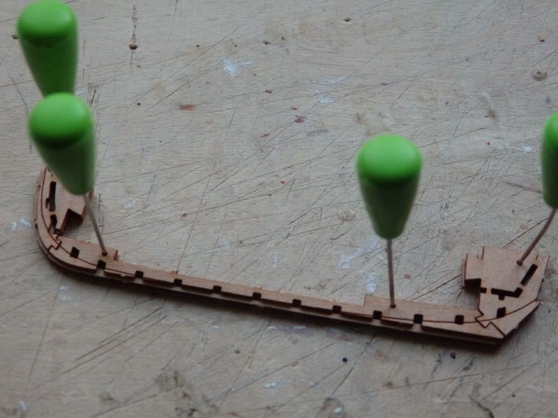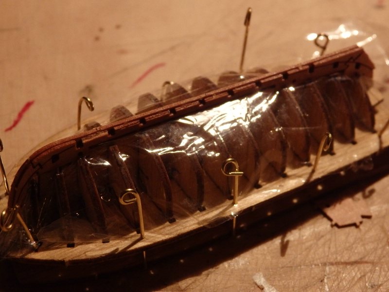 Man muss zunächst eine Form (heißt das "Malle"?) bauen und mit Folie abdecken, auf der man dann die 1 mm breiten Plänkchen einsteckt und evtl. mit einem Tröpfchen Leim befestigt. Alle Planken sollte man kurz wässern, damit sie gebogen werden können. Die Spanten knicken trotzdem leicht ab, was aber dem späteren Bau nicht schadet. Danach wird beplankt. Die Planken haben bereits die richtige, gebogene Form, und sie passen hervorragend. Allerdings hatte ich auf Backbord Probleme beim Kleben der ersten zwei Planken im Bugbereich. Weder Weißleim noch Sekundenkleber noch Pattex hielten, weil ich diese eben noch nicht gewässert und vorgebogen hatte (Erfahrung!!!). Na ja, irgendwann hat es dann doch geklappt.