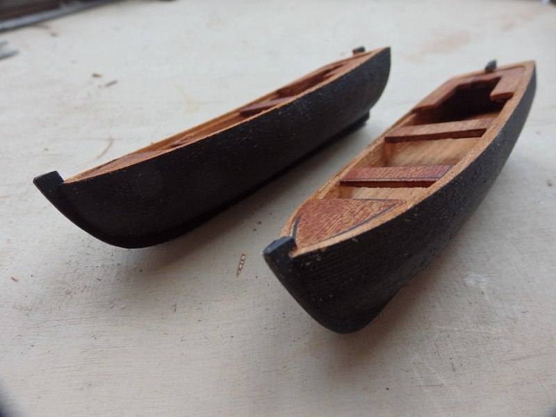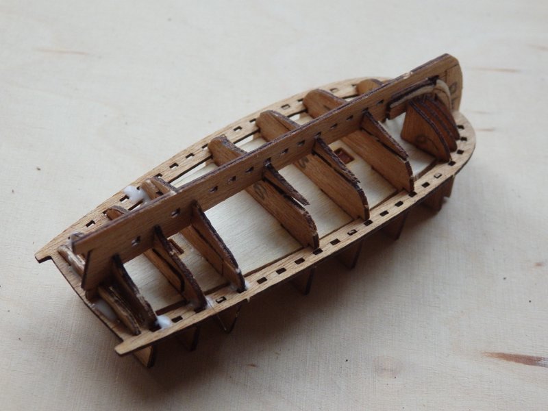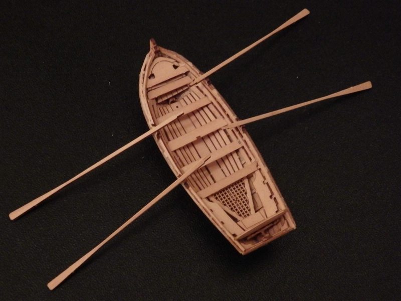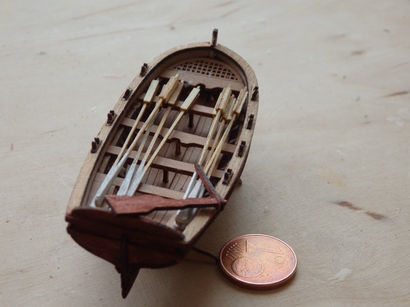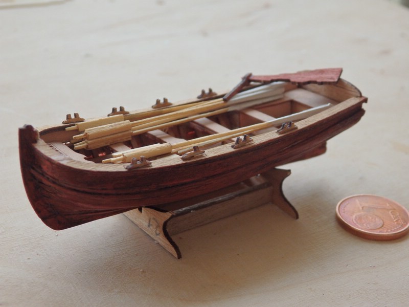 Ich habe mich für andere Beiboote entschieden. Der Bausatz von Corel ist wie ein Rückschritt in die Steinzeit des Holzmodellbaus. Die (sehr wenigen) Teile der Boote müssen mit der Laubsäge aus dem äußerst brüchigen Material herausgesägt werden.