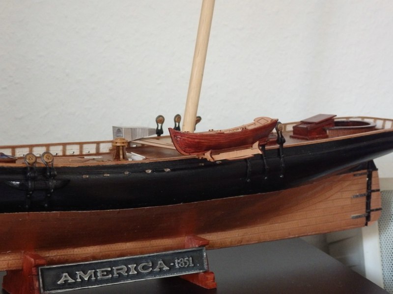 Das sind HERRLICHE Boote! Tolle Arbeit! Ich meine, dass ein David achtern von den Wanten war- und einer in der Höhe des Gangspills, Denk dran. Das Segel muss ja Raum haben... Im Photo der "America" in Boston (1 David) und vor allem in Annapolis (beide) siehst Du die -denke dran, dass das Schiff schräg von der Seite gesehen wird- dann siehst Du die Konstruktion. Die Davids tragen hier oben die leichten Rahen der Toppsegel.