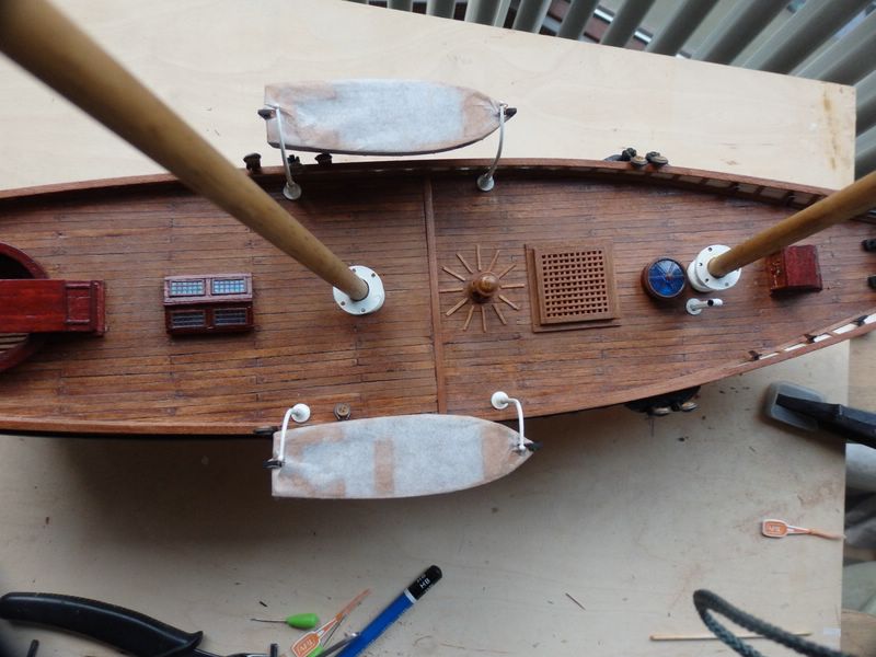 unter einer Persenning kann man diese ja nicht erkennen. Ich habe die Boote mal probehalber an die Davits gehängt. Die Persenning werde ich vielleicht noch mal einfärben, wenn sich der Transparentlook nach dem Trocknen nicht noch gibt. Nach der Endmontage werden die Davits seitlich abgespannt. Das geschieht aber erst, wenn die Wanten "stehen".