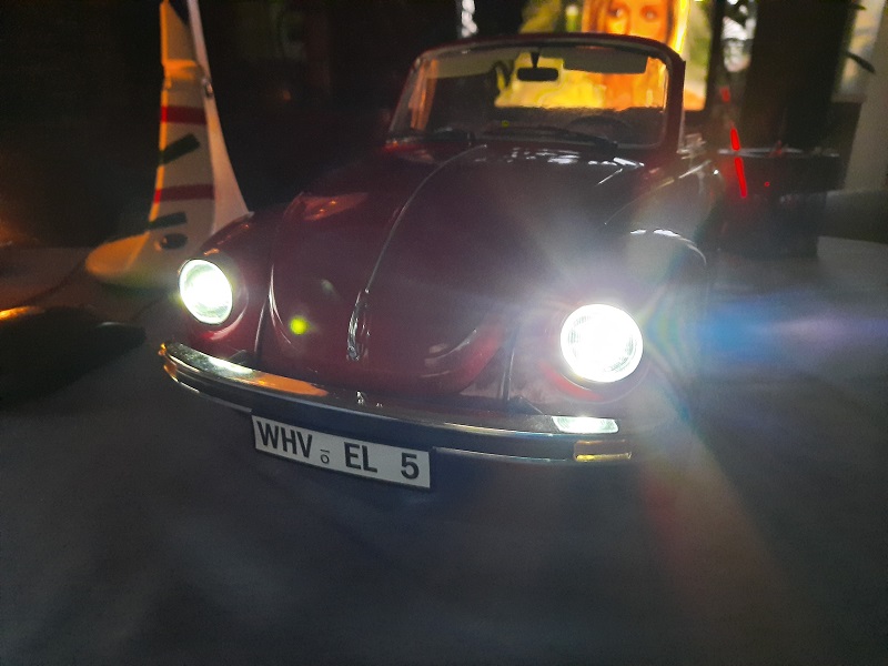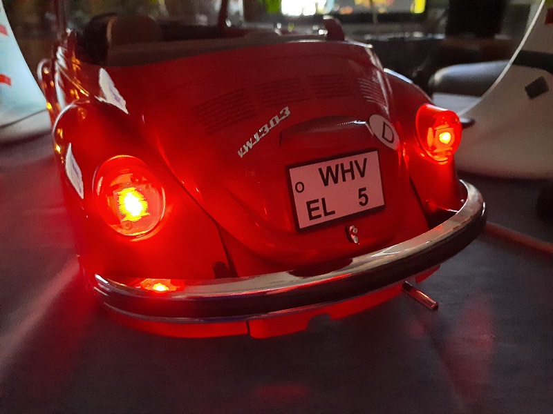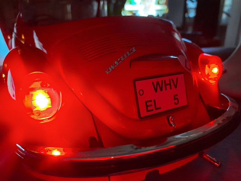 um die Beleuchtung, das Bremslicht, das Hauptlicht und die Hupe auszuprobieren. Die Lenkung funktioniert auch gut. Vorne steht er etwas hochbeinig dar, ist auch nicht