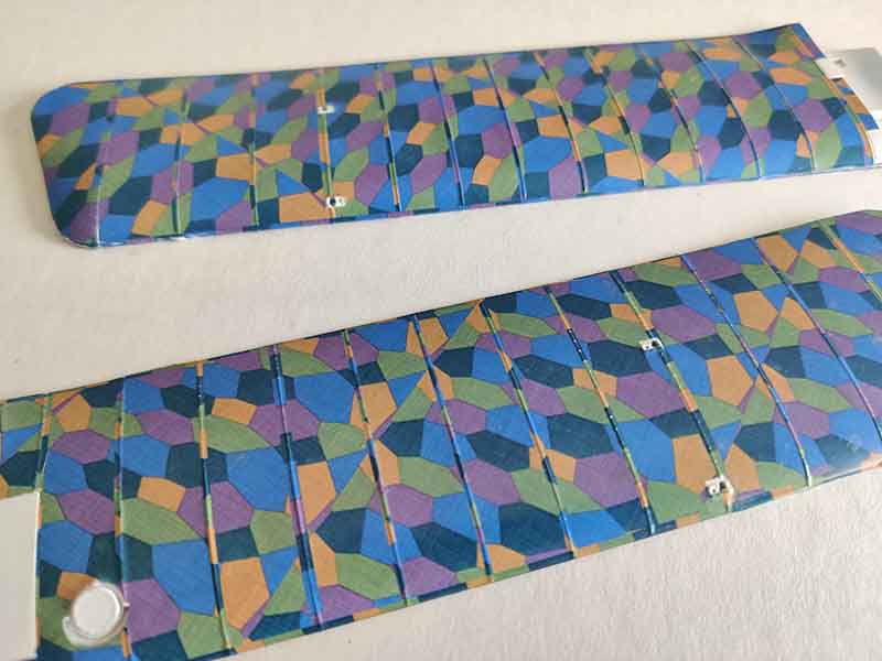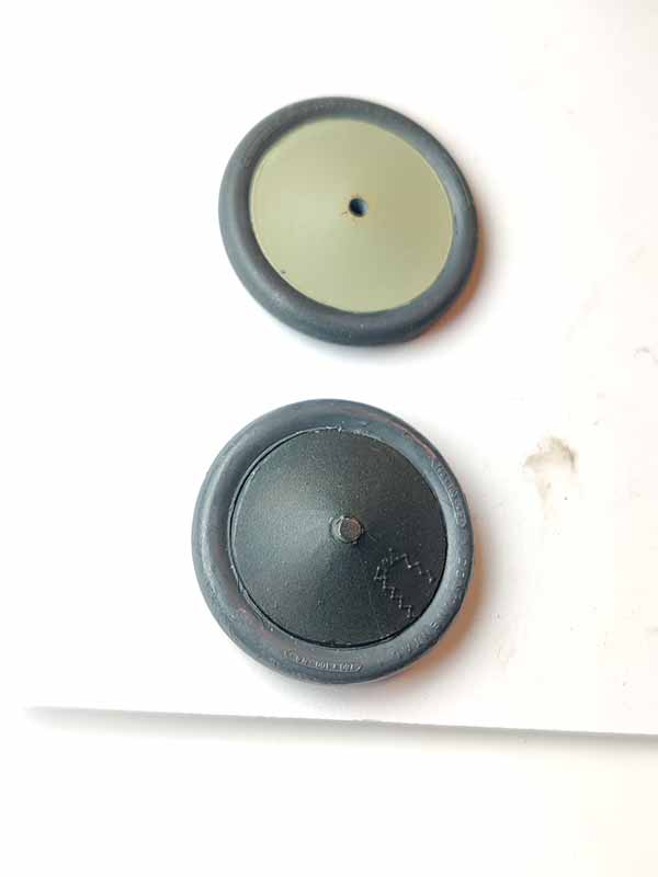 Eigentlich sind die Radkappen bei der Maschine schwarz bemalt. Ab Werk kammen sie aber mit Lozenge-Bespannung und ich möchte das Schwarz gerne so auftragen, dass das Lozenge noch durchschimmert. Hier einmal Probeweise aufeinander gelegt.