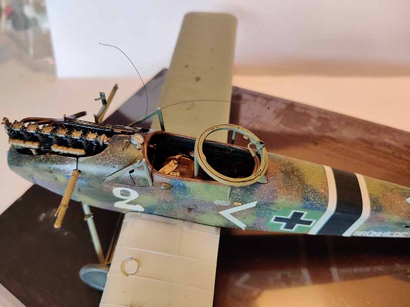 Ach ja, mittlerweile ist aus dem Eindecker auch endlich ein echter Doppeldecker geworden. Den oberen Flügel habe ich mit einem etwas helleren braun gealtert als den unteren. Allerdings ist mir der Farbunterschied etwas zu krass, hier bessere ich bei Gelegenheit nochmal nach.