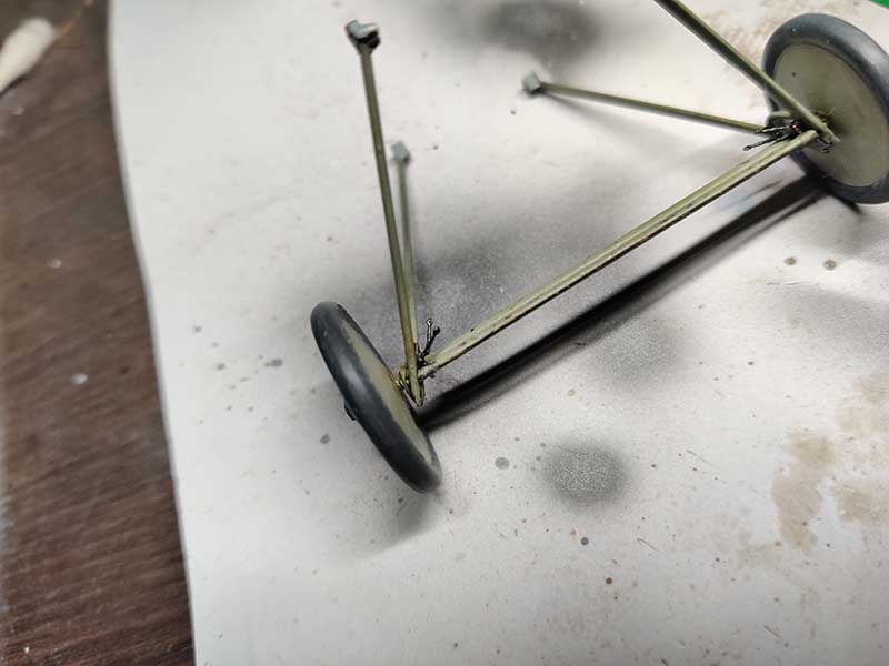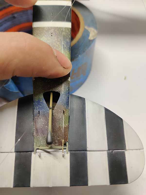 Dann habe ich die unteren Steuerseile für das Höhenruder angebracht und auch direkt gespannt. Das unter Höhenruder habe ich dann auch zunächst mit brauner und grüner Ölfarbe gealtert.