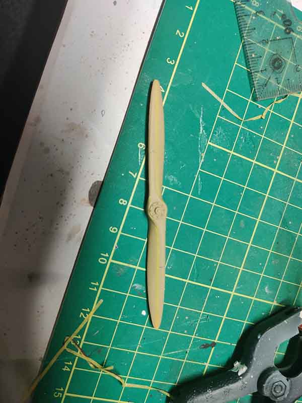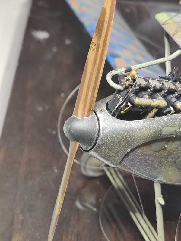 Anders als bei den Flugzeugen der Allierten haben die Deutschen - sehr zum Leidwesen der Modellbaugemeinde - ausschließlich laminierte Propeller ohne Lackierung genutzt. Die Schwierigkeit bei der Darstellung liegt hier darin, 5-7 gerade Holzschichten auf ein durchweg geschwungenes Bauteil auzuzeichnen. Gibt viele Leute, die das mit Tape perfekt abkleben können, ich gehöre leider nicht dazu. Stattdessen nutze ich immer einen Tapestreifen als Anhalt und zeichne die Schichten dann mehr oder weniger Freihand mit dem Pinsel auf. Dann begradige ich nach und nach die einzelnen Schichten, bis irgendwann das Ergebniss einigermaßen realistisch aussieht. Ich habe einige Phasen dieses Prozesses mal unten auf Foto festgehalten.