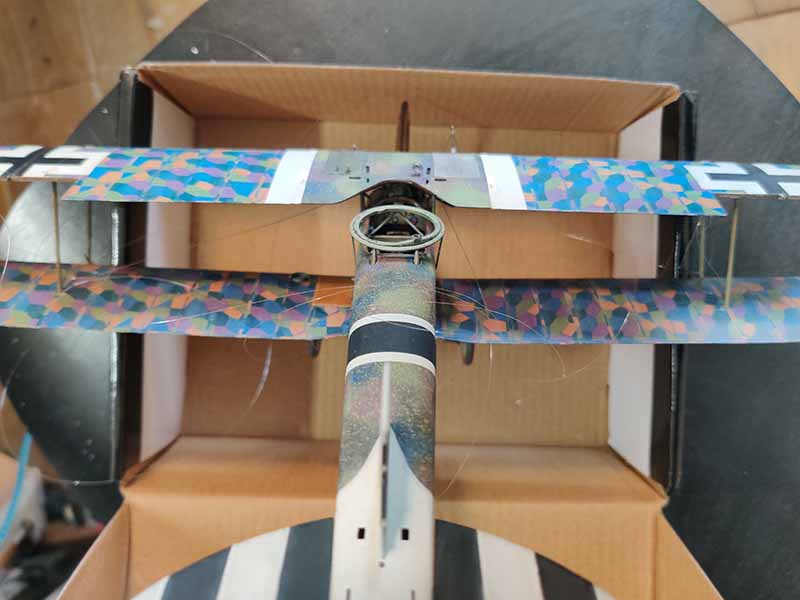 Zum Schluss habe ich soweit möglich schon mal die Leinen entsprechend eingefädelt, sowohl an den Flügeln als auch am Fahrwerk. Verspannt ist allerdings noch nichts, das kommt dann wenn die oberen Tragflächen drauf sind.